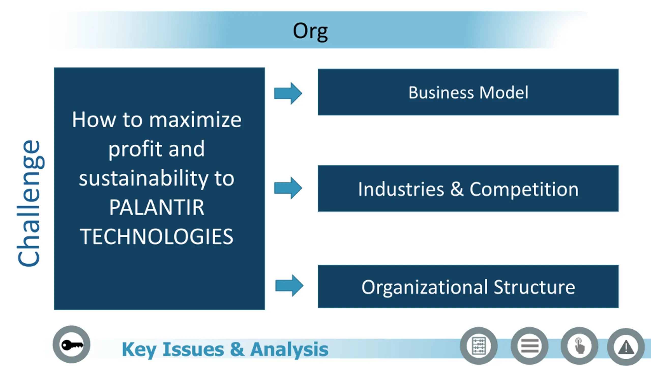 Org Business Model How to maximize profit and sustainability to PALANTIR TECHNOLOGIES Challenge Industries & Competition Organizational Structure Key Issues & Analysis