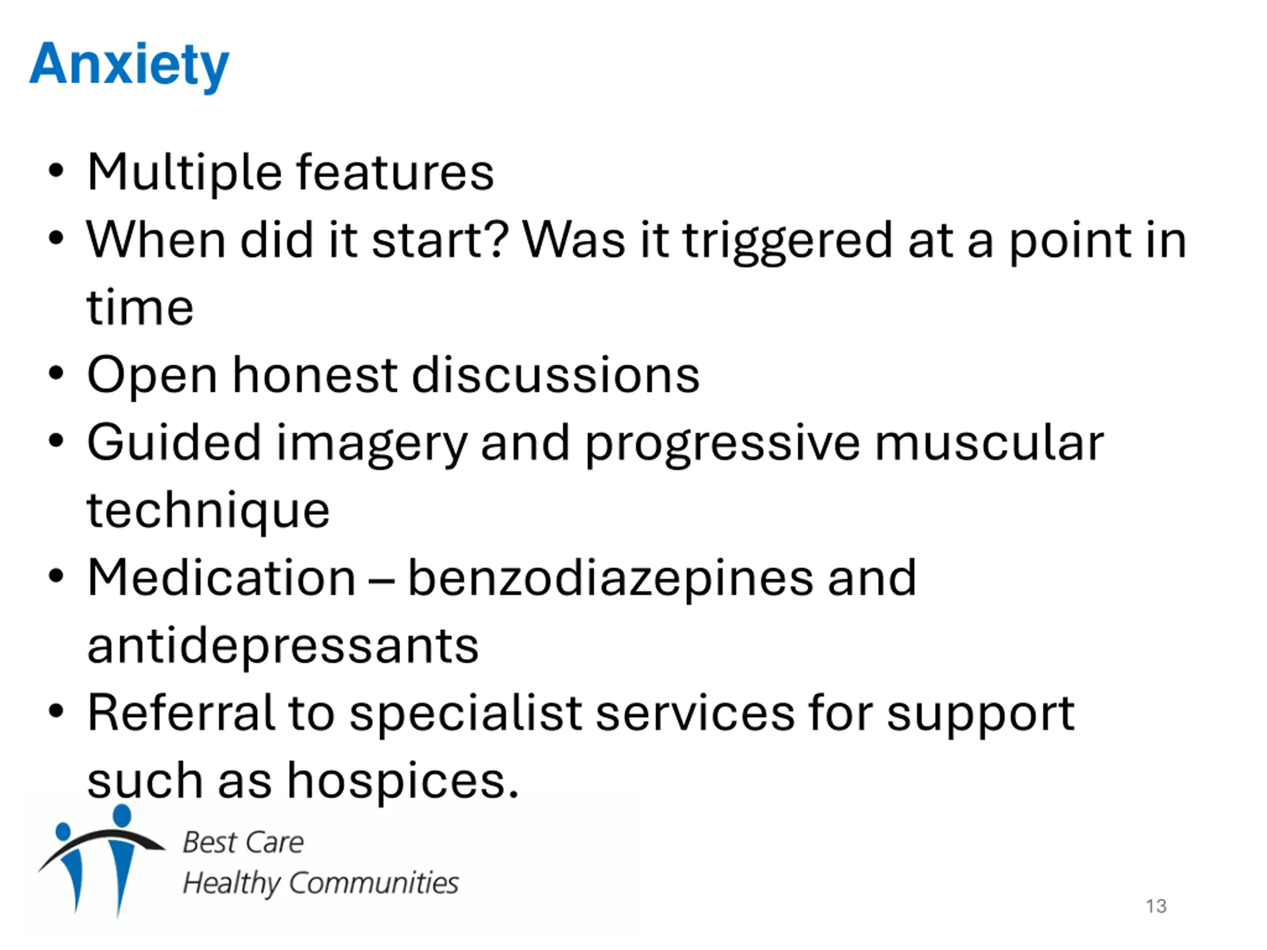 Anxiety Multiple features When did it start? Was it triggered at a point in time Open honest discussions Guided imagery and progressive muscular technique Medication benzodiazepines and antidepressants Referral to specialist services for support such as hospices. 13