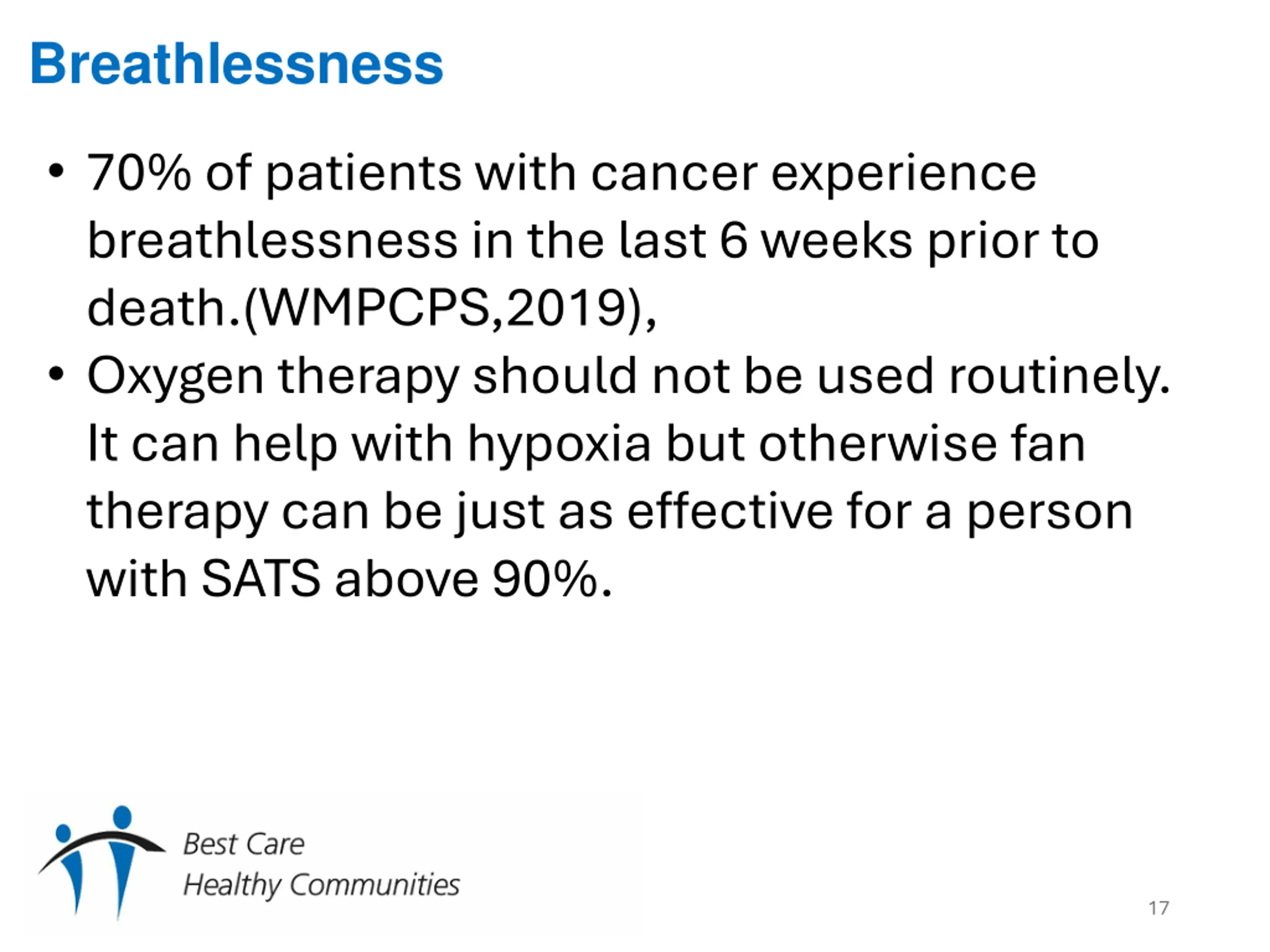 Breathlessness 70% of patients with cancer experience breathlessness in the last 6 weeks prior to death.(WMPCPS,2019), Oxygen therapy should not be used routinely. It can help with hypoxia but otherwise fan therapy can be just as effective for a person with SATS above 90%. 17