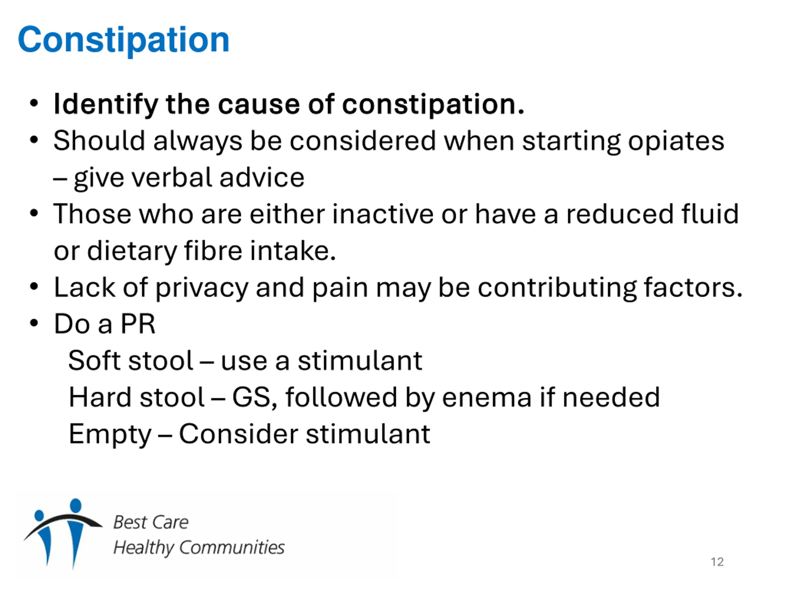 Constipation Identify the cause of constipation. Identify the cause of constipation. Should always be considered when starting opiates give verbal advice Those who are either inactive or have a reduced fluid or dietary fibre intake. Lack of privacy and pain may be contributing factors. Do a PR Soft stool use a stimulant Hard stool GS, followed by enema if needed Empty Consider stimulant 12
