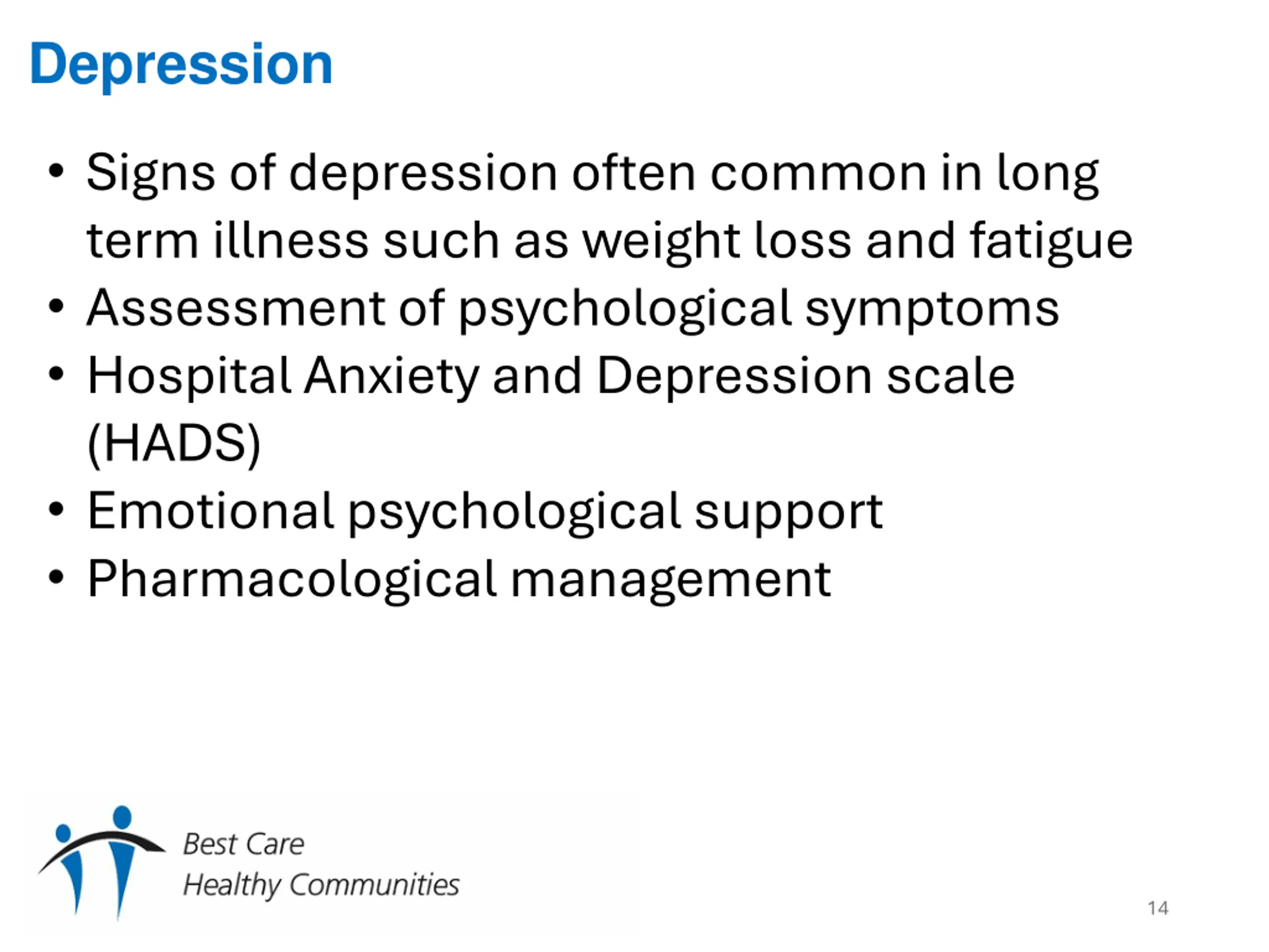 Depression Signs of depression often common in long term illness such as weight loss and fatigue Assessment of psychological symptoms Hospital Anxiety and Depression scale (HADS) Emotional psychological support Pharmacological management 14