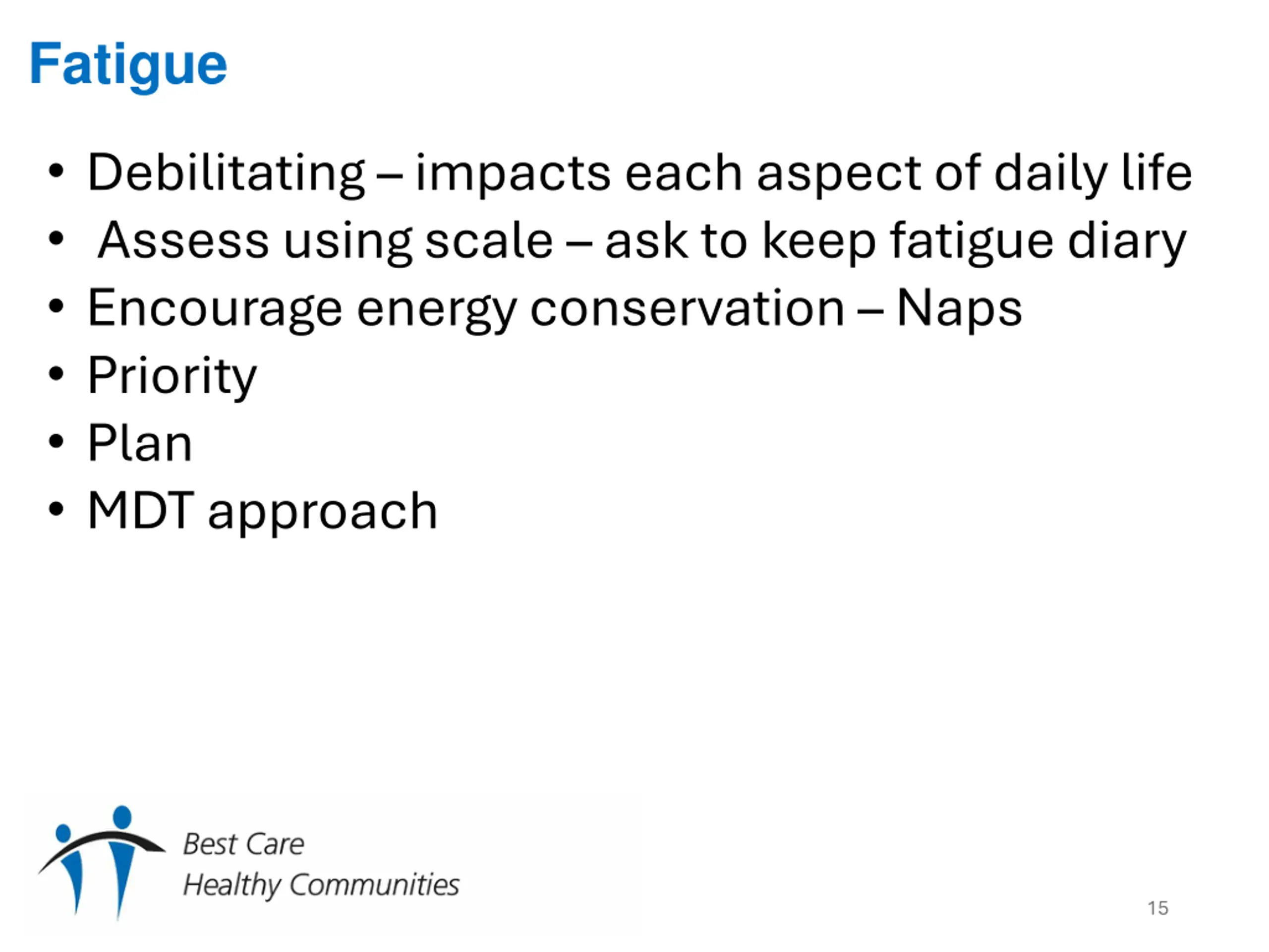Fatigue Debilitating impacts each aspect of daily life Assess using scale ask to keep fatigue diary Encourage energy conservation Naps Priority Plan MDT approach 15