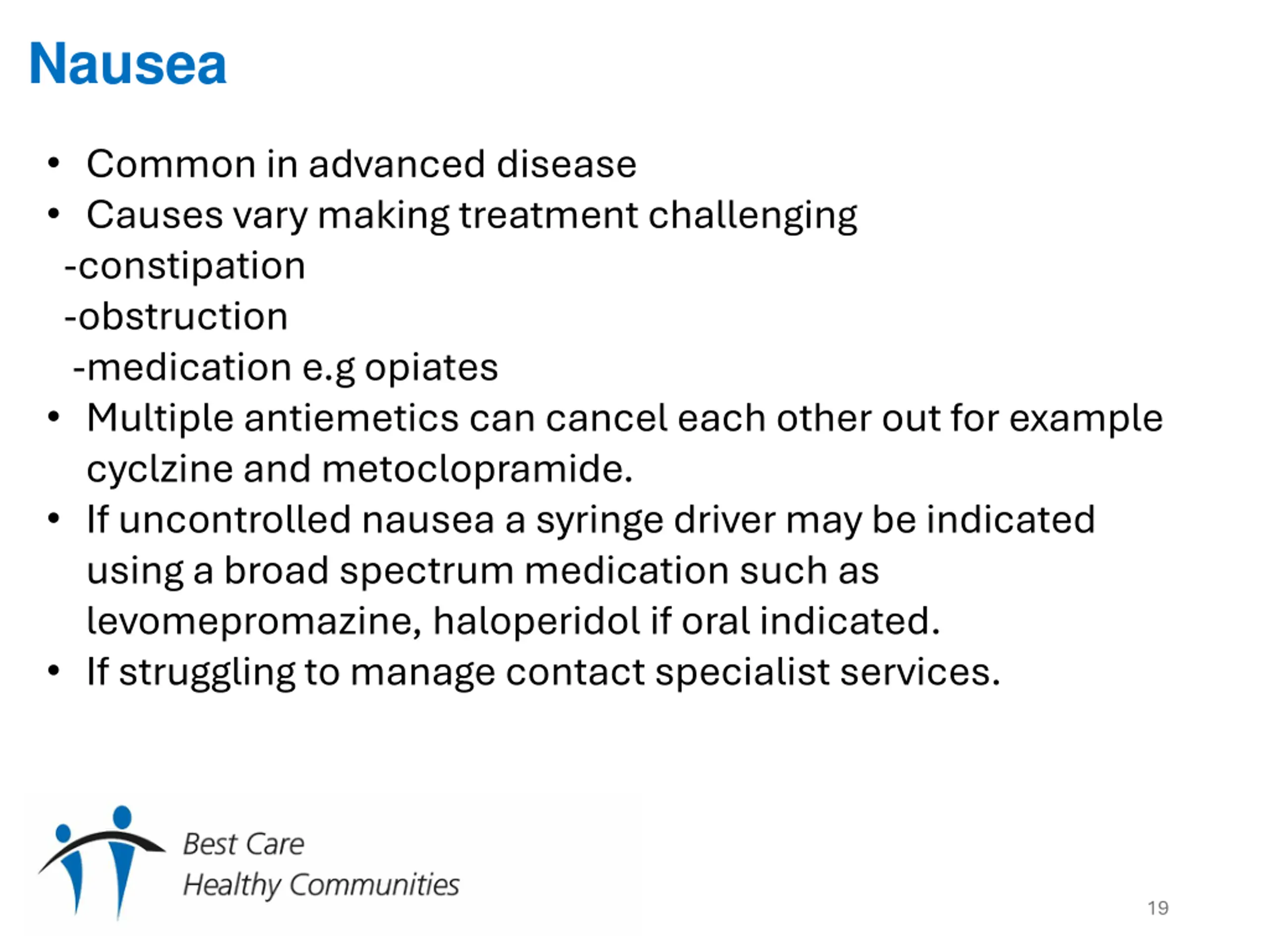 Nausea Common in advanced disease Causes vary making treatment challenging -constipation -obstruction -medication e.g opiates Multiple antiemetics can cancel each other out for example cyclzine and metoclopramide. If uncontrolled nausea a syringe driver may be indicated using a broad spectrum medication such as levomepromazine, haloperidol if oral indicated. If struggling to manage contact specialist services. 19