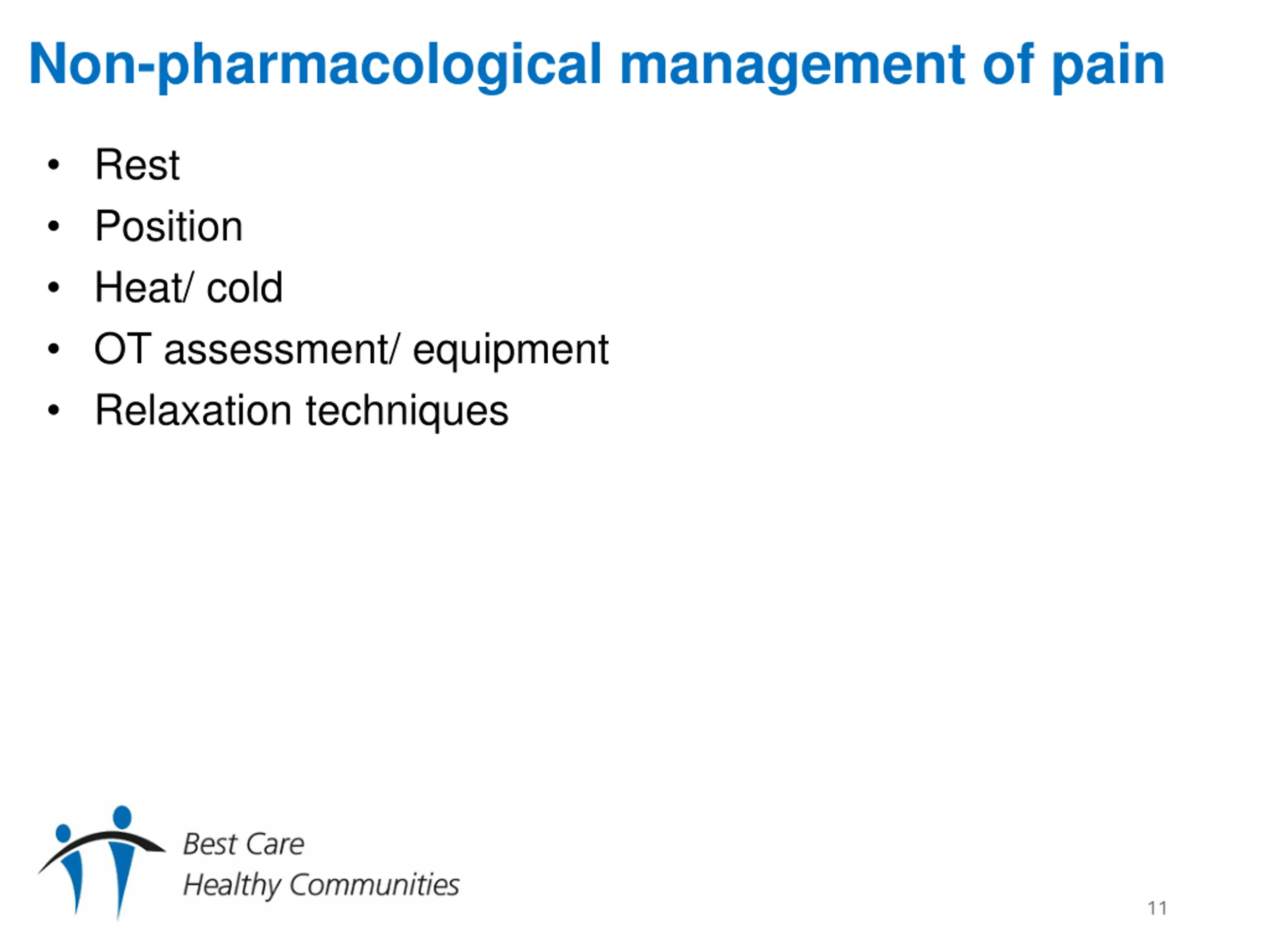 Non-pharmacological management of pain Rest Position Heat/ cold OT assessment/ equipment Relaxation techniques 11