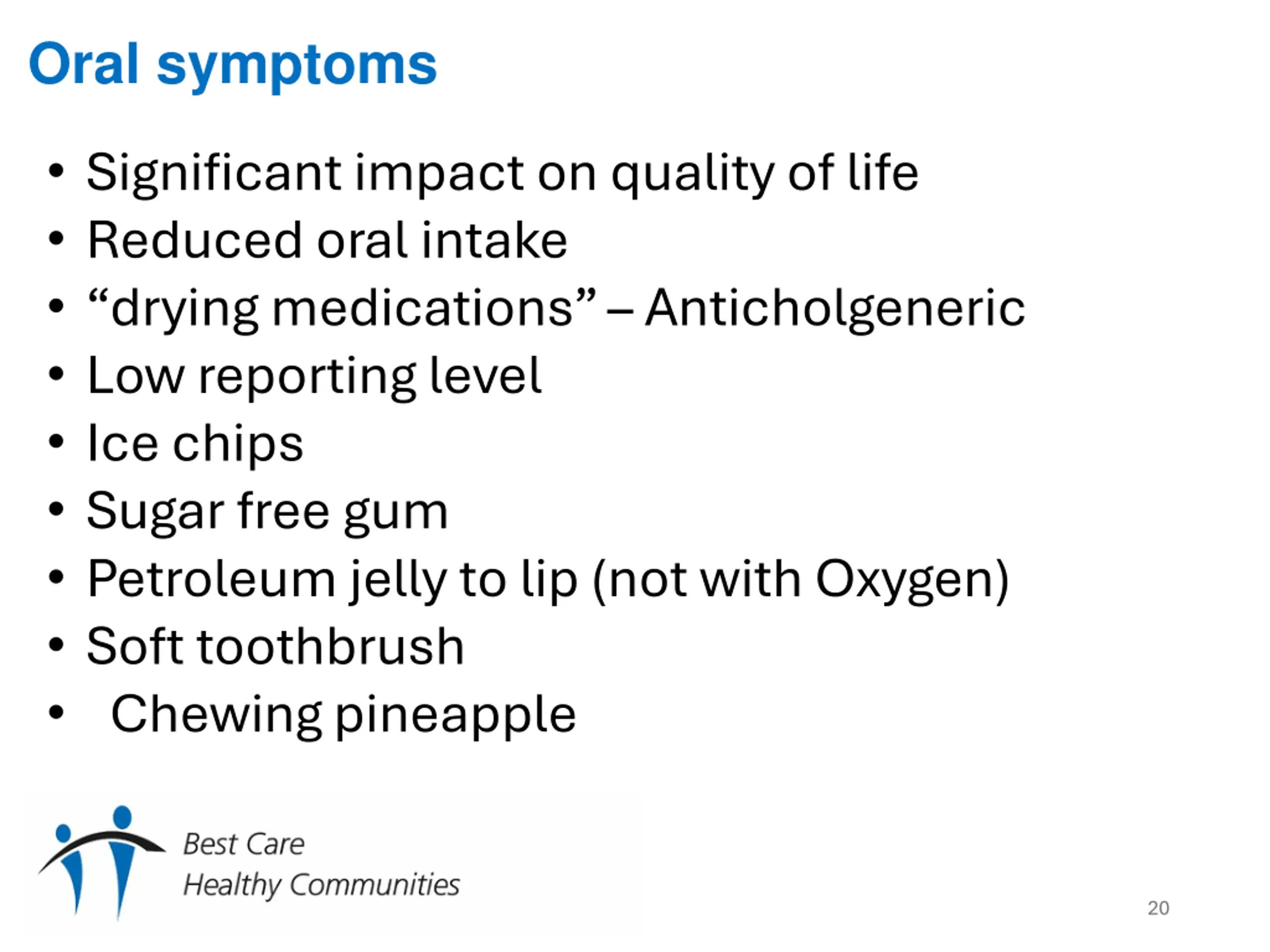 Oral symptoms Significant impact on quality of life Reduced oral intake drying medications Anticholgeneric Low reporting level Ice chips Sugar free gum Petroleum jelly to lip (not with Oxygen) Soft toothbrush Chewing pineapple 20