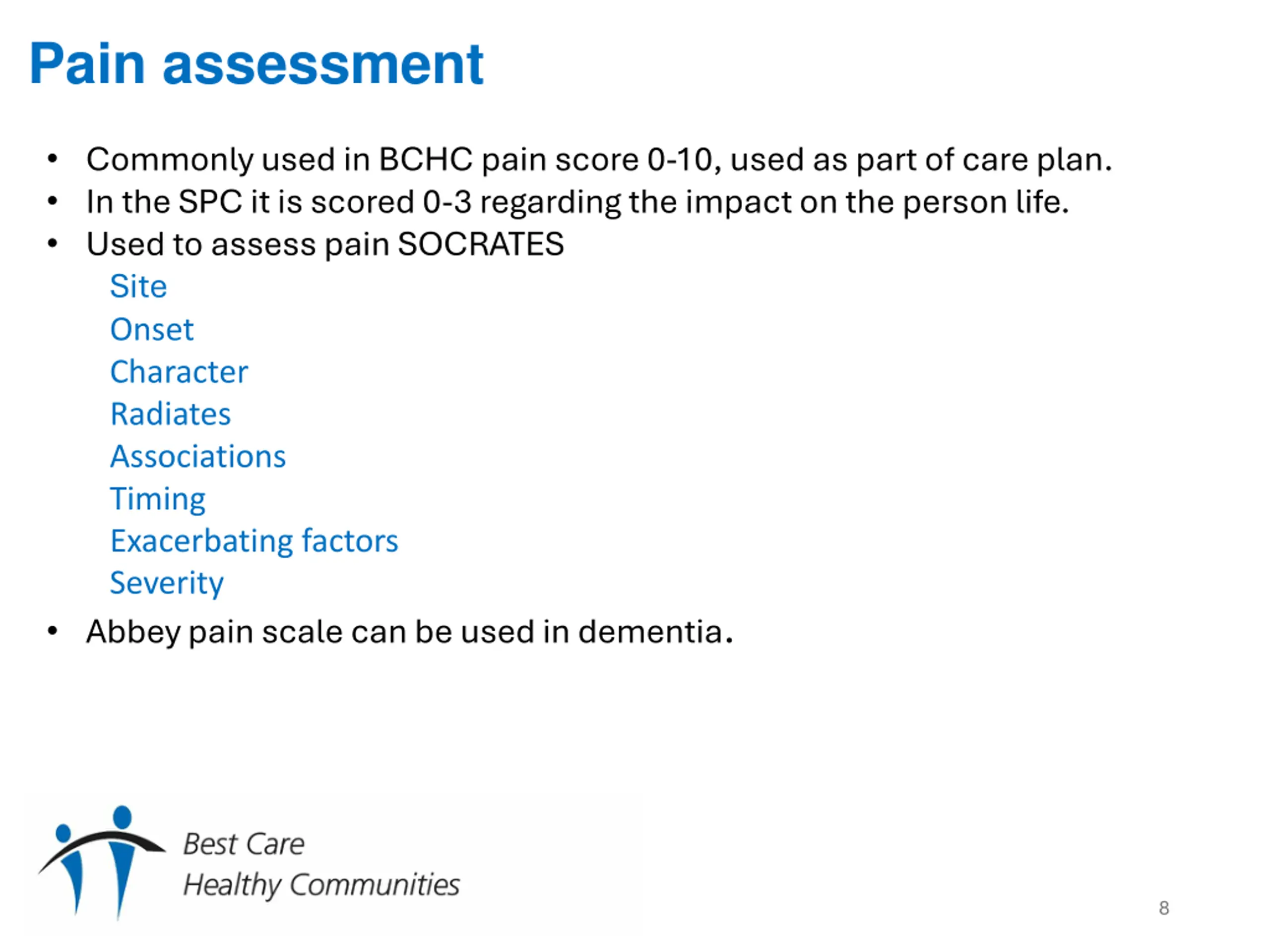 Pain assessment Commonly used in BCHC pain score 0-10, used as part of care plan. In the SPC it is scored 0-3 regarding the impact on the person life. Used to assess pain SOCRATES Site Onset Character Radiates Associations Timing Exacerbating factors Severity Abbey pain scale can be used in dementia. 8