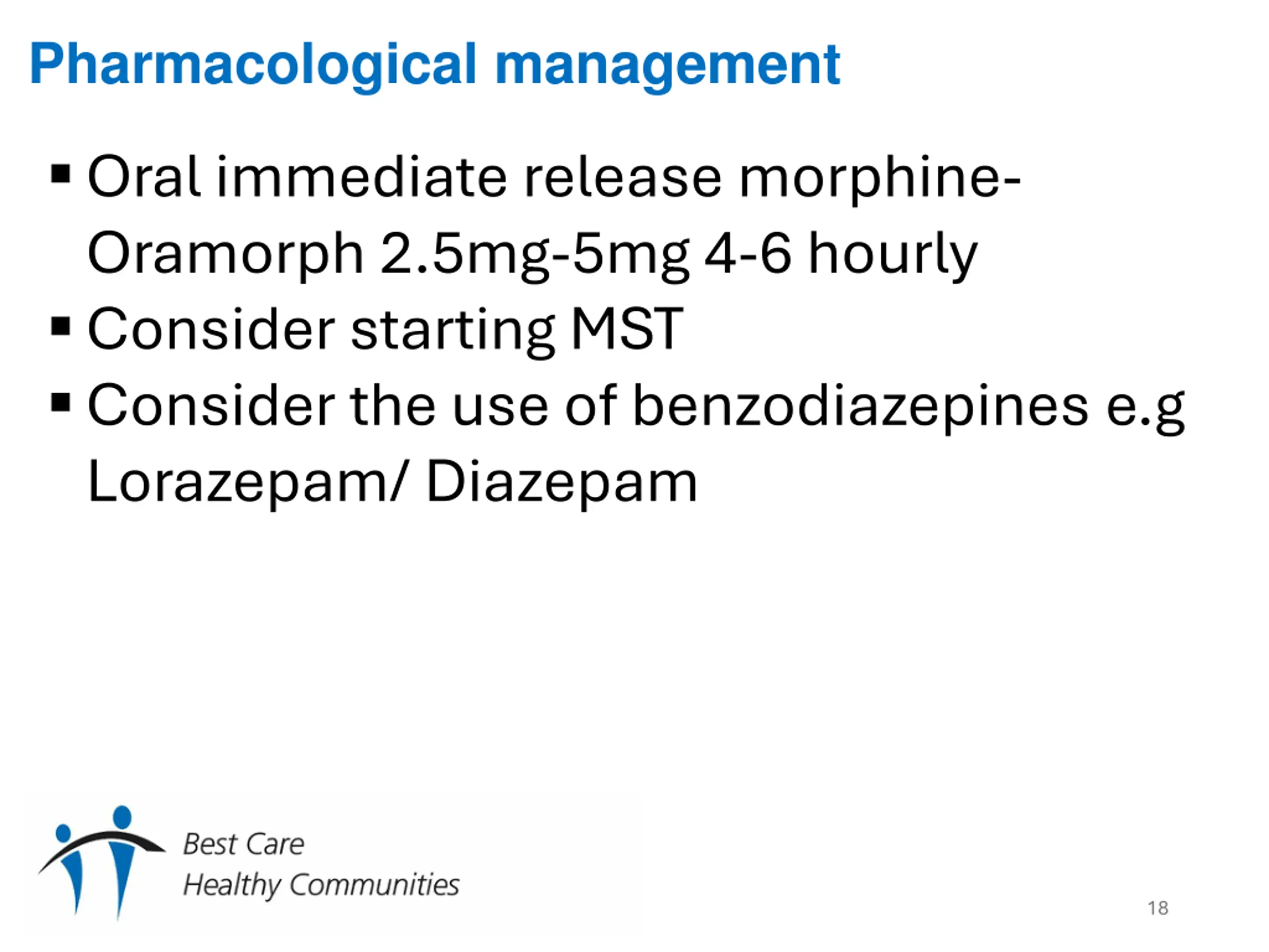 Pharmacological management Oral immediate release morphine- Oramorph 2.5mg-5mg 4-6 hourly Consider starting MST Consider the use of benzodiazepines e.g Lorazepam/ Diazepam 18