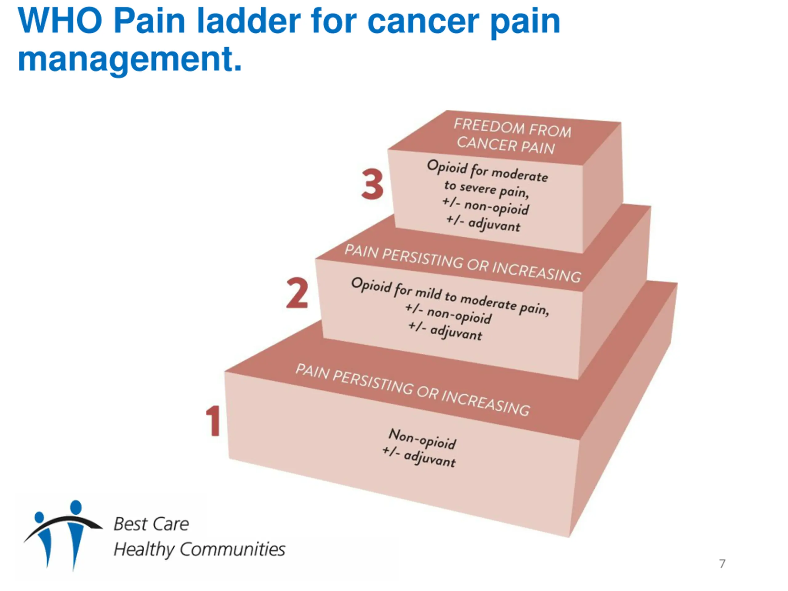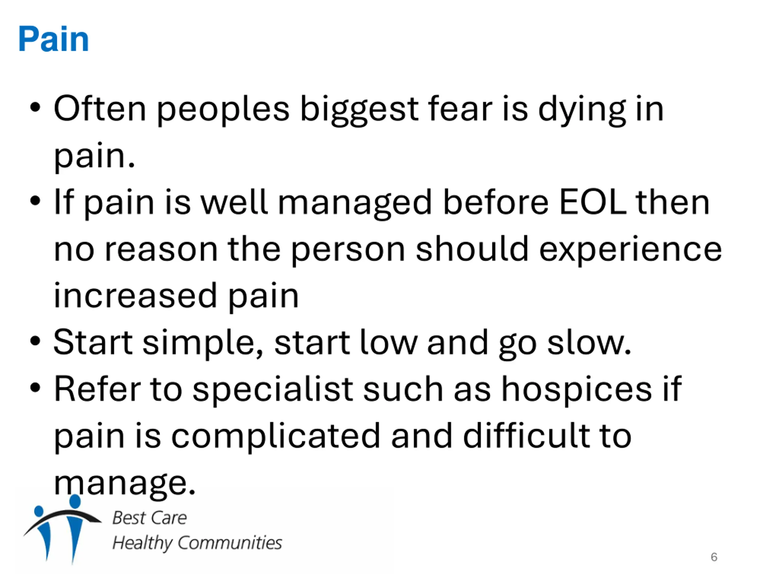 Pain Often peoples biggest fear is dying in pain. If pain is well managed before EOL then no reason the person should experience increased pain Start simple, start low and go slow. Refer to specialist such as hospices if pain is complicated and difficult to manage. 6