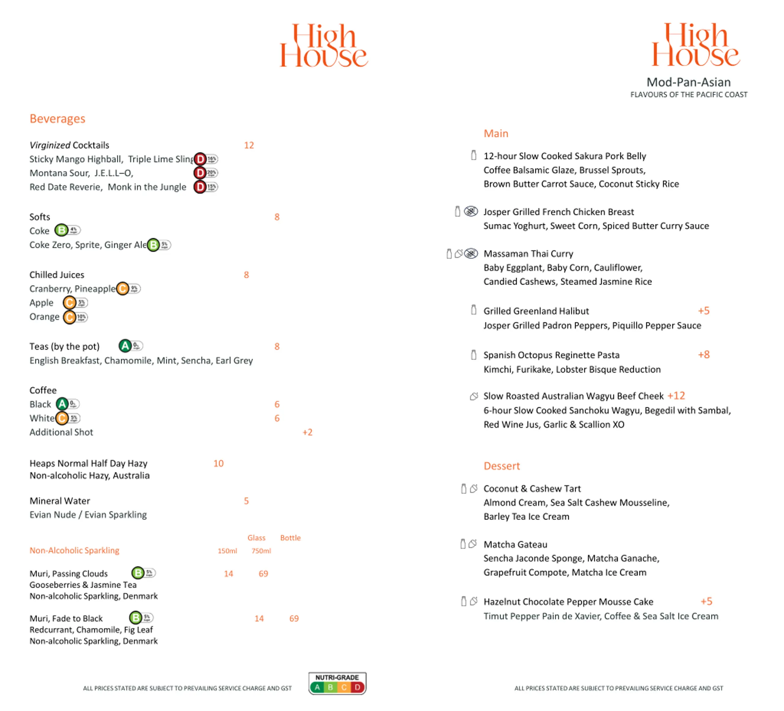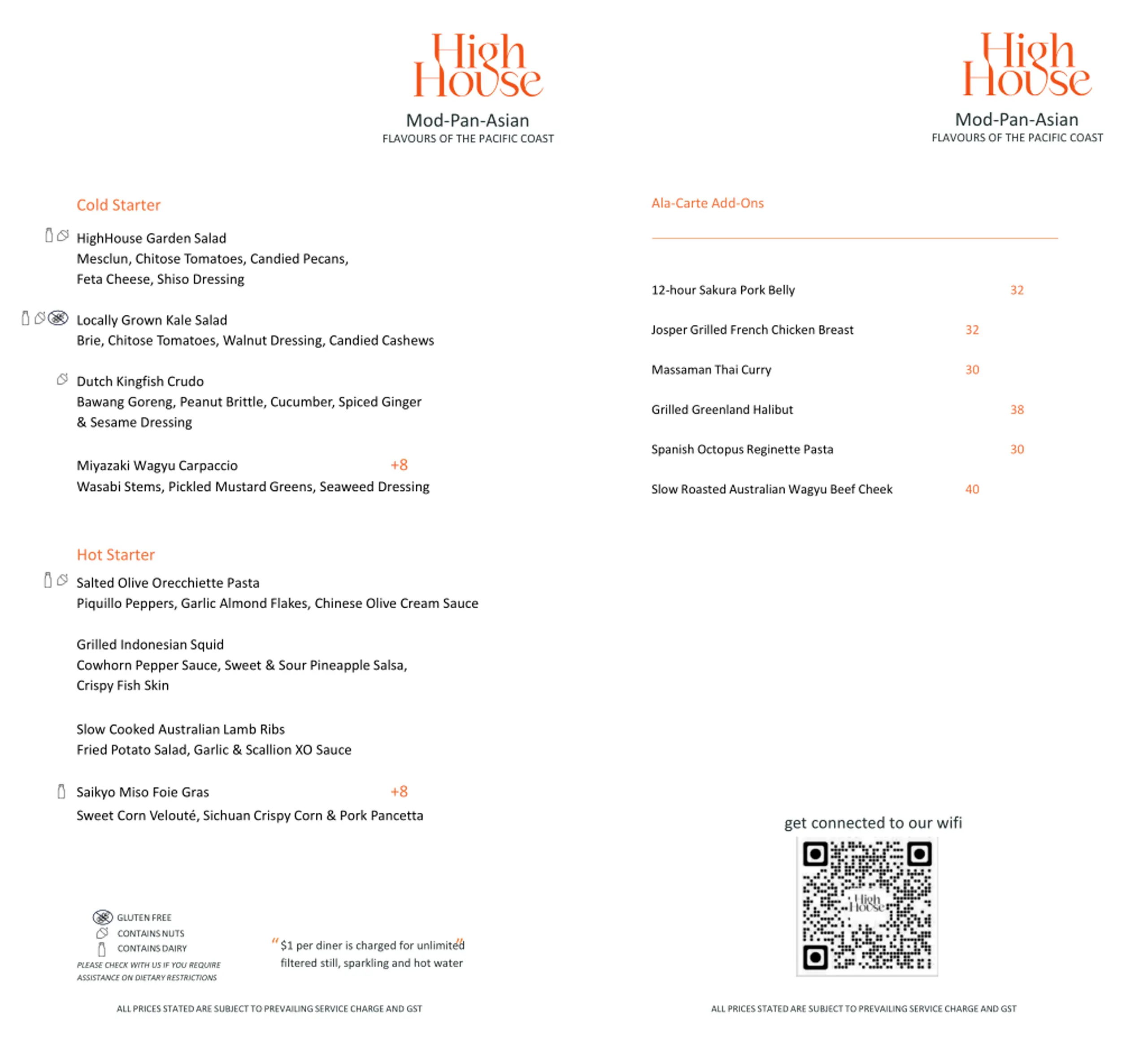 Mod-Pan-Asian FLAVOURS OF THE PACIFIC COAST Mod-Pan-Asian FLAVOURS OF THE PACIFIC COAST Ala-Carte Add-Ons Cold Starter HighHouse Garden Salad Mesclun, Chitose Tomatoes, Candied Pecans, Feta Cheese, Shiso Dressing 12-hour Sakura Pork Belly 32 Locally Grown Kale Salad Brie, Chitose Tomatoes, Walnut Dressing, Candied Cashews Josper Grilled French Chicken Breast 32 Massaman Thai Curry 30 Dutch Kingfish Crudo Bawang Goreng, Peanut Brittle, Cucumber, Spiced Ginger & Sesame Dressing Grilled Greenland Halibut 38 Spanish Octopus Reginette Pasta 30 +8 Miyazaki Wagyu Carpaccio Wasabi Stems, Pickled Mustard Greens, Seaweed Dressing Slow Roasted Australian Wagyu Beef Cheek 40 Hot Starter Salted Olive Orecchiette Pasta Piquillo Peppers, Garlic Almond Flakes, Chinese Olive Cream Sauce Grilled Indonesian Squid Cowhorn Pepper Sauce, Sweet & Sour Pineapple Salsa, Crispy Fish Skin Slow Cooked Australian Lamb Ribs Fried Potato Salad, Garlic & Scallion XO Sauce +8 Saikyo Miso Foie Gras Sweet Corn Velout , Sichuan Crispy Corn & Pork Pancetta get connected to our wifi GLUTEN FREE CONTAINS NUTS CONTAINS DAIRY $1 per diner is charged for unlimited filtered still, sparkling and hot water PLEASE CHECK WITH US IF YOU REQUIRE ASSISTANCE ON DIETARY RESTRICTIONS ALL PRICES STATED ARE SUBJECT TO PREVAILING SERVICE CHARGE AND GST ALL PRICES STATED ARE SUBJECT TO PREVAILING SERVICE CHARGE AND GST