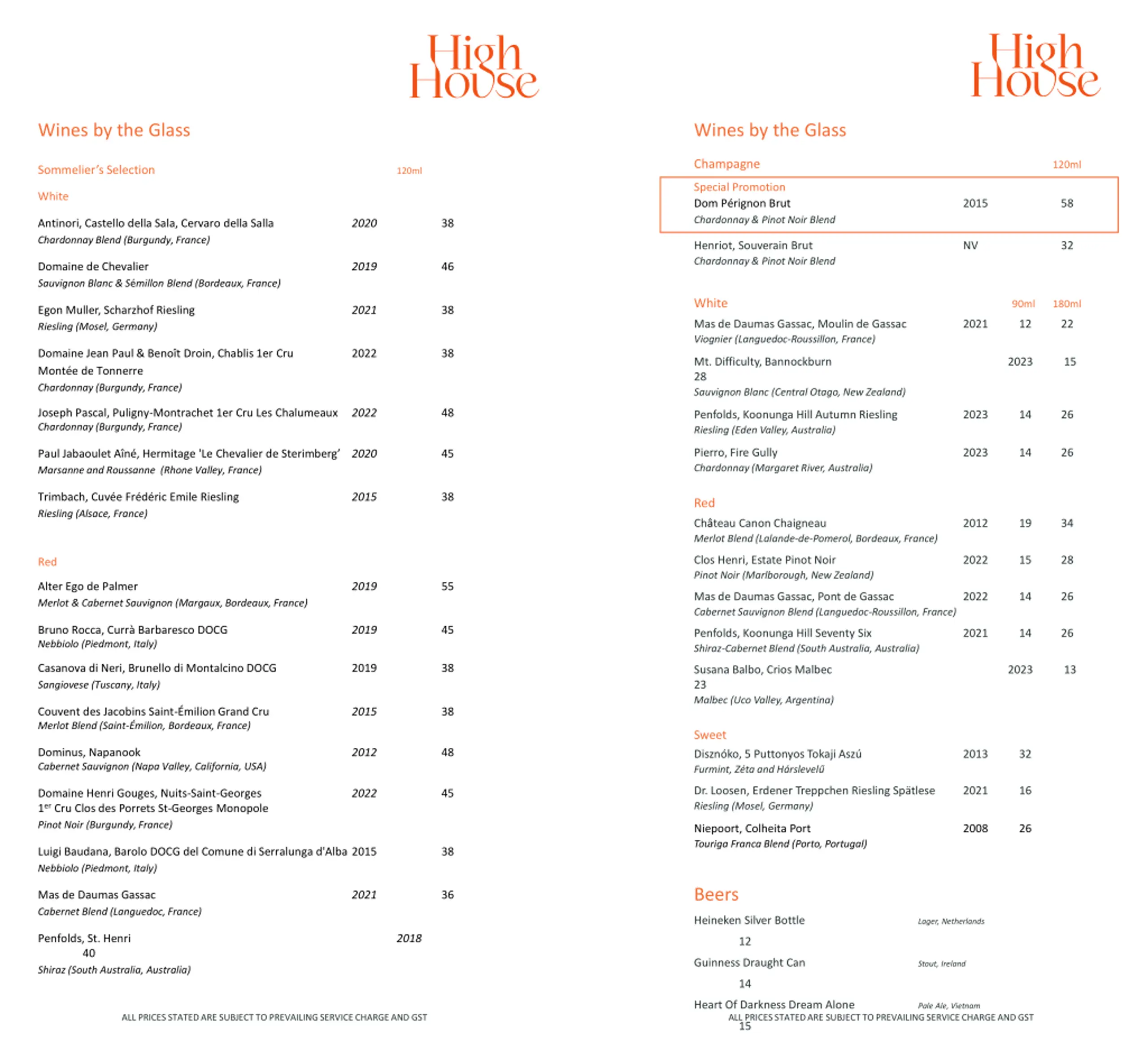 Wines by the Glass Wines by the Glass Champagne 120ml Sommelier s Selection 120ml Special Promotion Dom P rignon Brut Chardonnay & Pinot Noir Blend White 2015 58 Antinori, Castello della Sala, Cervaro della Salla Chardonnay Blend (Burgundy, France) 2020 38 Henriot, Souverain Brut Chardonnay & Pinot Noir Blend NV 32 Domaine de Chevalier Sauvignon Blanc & S millon Blend (Bordeaux, France) 2019 46 White 90ml 180ml Egon Muller, Scharzhof Riesling Riesling (Mosel, Germany) 2021 38 Mas de Daumas Gassac, Moulin de Gassac Viognier (Languedoc-Roussillon, France) 2021 12 22 Domaine Jean Paul & Beno t Droin, Chablis 1er Cru Mont e de Tonnerre Chardonnay (Burgundy, France) 2022 38 Mt. Difficulty, Bannockburn 28 Sauvignon Blanc (Central Otago, New Zealand) 2023 15 Joseph Pascal, Puligny-Montrachet 1er Cru Les Chalumeaux Chardonnay (Burgundy, France) 2022 48 Penfolds, Koonunga Hill Autumn Riesling Riesling (Eden Valley, Australia) 2023 14 26 Pierro, Fire Gully Chardonnay (Margaret River, Australia) 2023 14 26 Paul Jabaoulet A n , Hermitage 'Le Chevalier de Sterimberg Marsanne and Roussanne (Rhone Valley, France) 2020 45 Trimbach, Cuv e Fr d ric Emile Riesling Riesling (Alsace, France) 2015 38 Red Ch teau Canon Chaigneau Merlot Blend (Lalande-de-Pomerol, Bordeaux, France) 2012 19 34 Clos Henri, Estate Pinot Noir Pinot Noir (Marlborough, New Zealand) 2022 15 28 Red Alter Ego de Palmer Merlot & Cabernet Sauvignon (Margaux, Bordeaux, France) 2019 55 Mas de Daumas Gassac, Pont de Gassac Cabernet Sauvignon Blend (Languedoc-Roussillon, France) 2022 14 26 Bruno Rocca, Curr Barbaresco DOCG Nebbiolo (Piedmont, Italy) 2019 45 Penfolds, Koonunga Hill Seventy Six Shiraz-Cabernet Blend (South Australia, Australia) 2021 14 26 Casanova di Neri, Brunello di Montalcino DOCG Sangiovese (Tuscany, Italy) 2019 38 Susana Balbo, Crios Malbec 23 Malbec (Uco Valley, Argentina) 2023 13 Couvent des Jacobins Saint- milion Grand Cru Merlot Blend (Saint- milion, Bordeaux, France) 2015 38 Sweet Dominus, Napanook Cabernet Sauvignon (Napa Valley, California, USA) 2012 48 Diszn ko, 5 Puttonyos Tokaji Asz Furmint, Z ta and H rslevel 2013 32 Dr. Loosen, Erdener Treppchen Riesling Sp tlese Riesling (Mosel, Germany) 2021 16 Domaine Henri Gouges, Nuits-Saint-Georges 1erCru Clos des Porrets St-Georges Monopole Pinot Noir (Burgundy, France) 2022 45 Niepoort, Colheita Port Touriga Franca Blend (Porto, Portugal) 2008 26 Luigi Baudana, Barolo DOCG del Comune di Serralunga d'Alba 2015 Nebbiolo (Piedmont, Italy) 38 Beers Mas de Daumas Gassac Cabernet Blend (Languedoc, France) 2021 36 Heineken Silver Bottle Lager, Netherlands Penfolds, St. Henri 40 Shiraz (South Australia, Australia) 2018 12 Guinness Draught Can Stout, Ireland 14 Heart Of Darkness Dream Alone Pale Ale, Vietnam ALL PRICES STATED ARE SUBJECT TO PREVAILING SERVICE CHARGE AND GST ALL PRICES STATED ARE SUBJECT TO PREVAILING SERVICE CHARGE AND GST 15 Heart Of Darkness Loose Rivet New England IPA, Vietnam