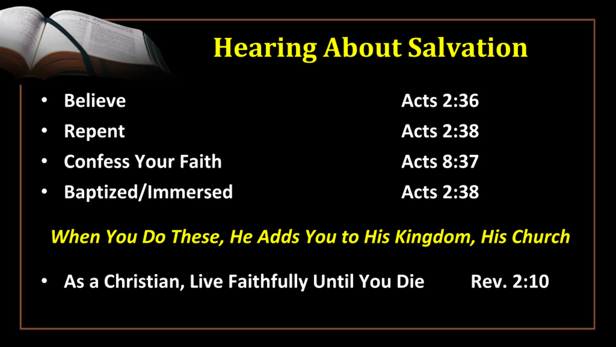 Hearing About Salvation Believe Repent Confess Your Faith Baptized/Immersed Acts 2:36 Acts 2:38 Acts 8:37 Acts 2:38 When You Do These, He Adds You to His Kingdom, His Church As a Christian, Live Faithfully Until You Die Rev. 2:10
