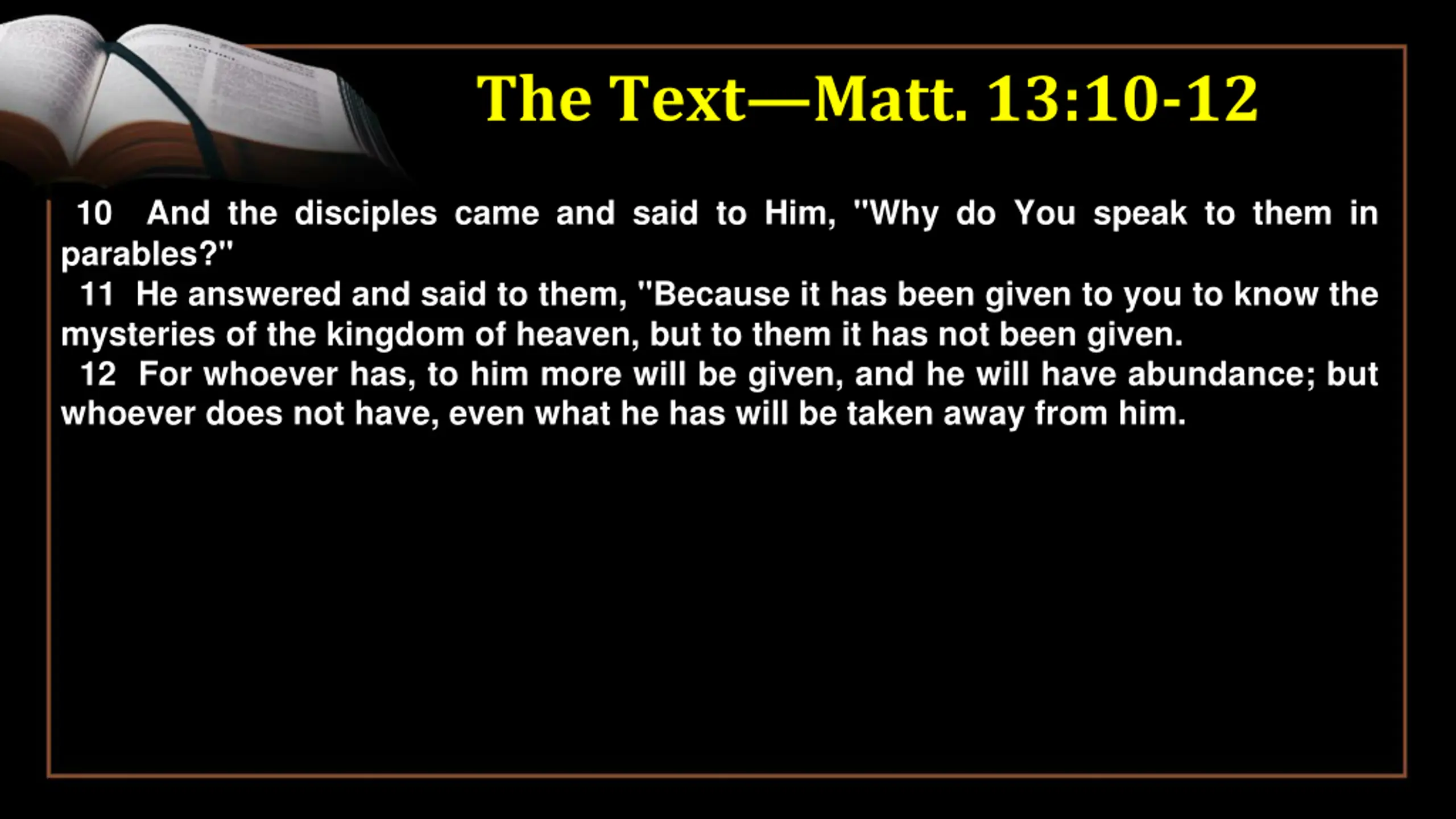 The TextMatt. 13:10-12 10 parables?" 11 He answered and said to them, "Because it has been given to you to know the mysteries of the kingdom of heaven, but to them it has not been given. 12 For whoever has, to him more will be given, and he will have abundance; but whoever does not have, even what he has will be taken away from him. And the disciples came and said to Him, "Why do You speak to them in