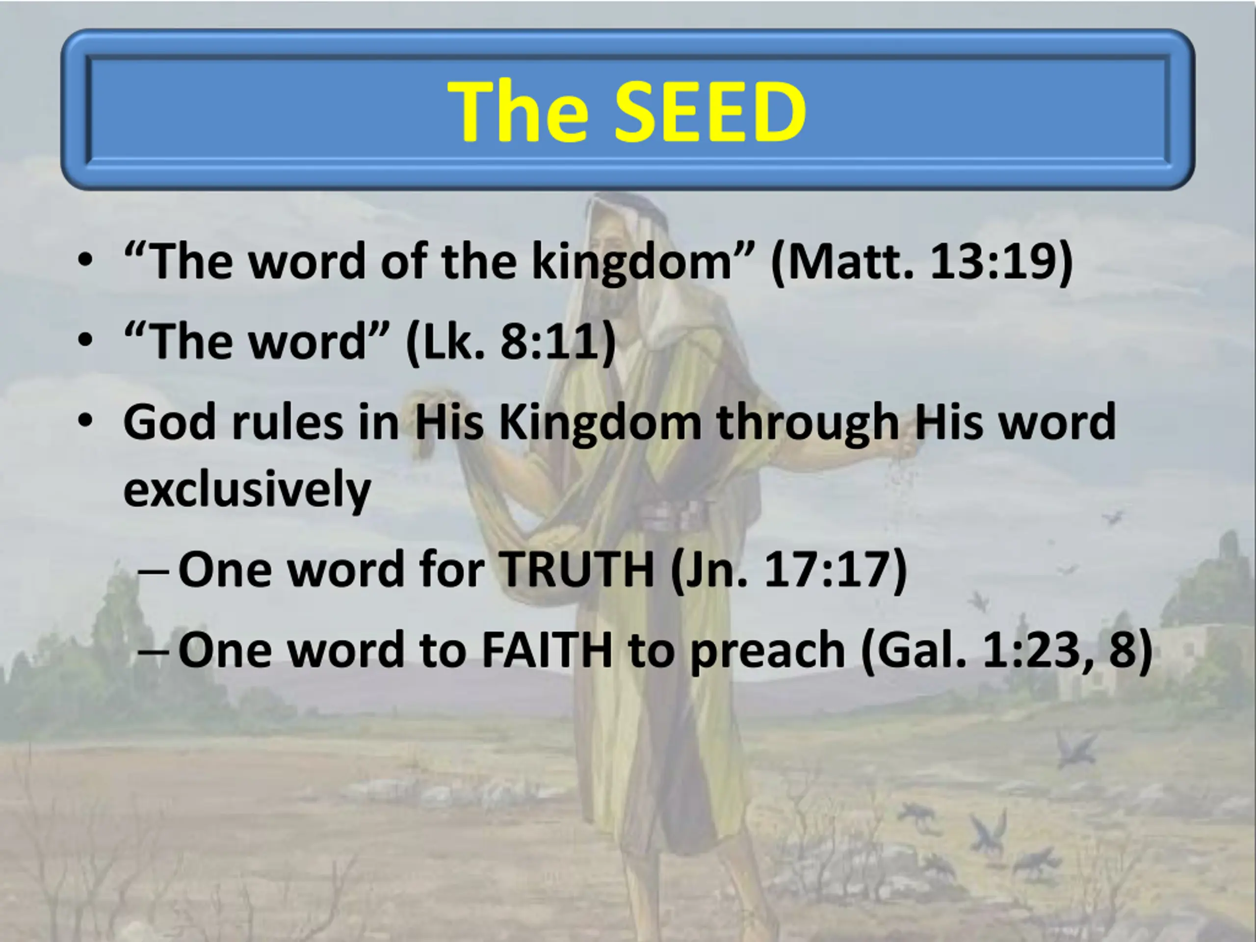 http://www.4kingdoms.com/sower.jpg The SEED The word of the kingdom (Matt. 13:19) The word (Lk. 8:11) God rules in His Kingdom through His word exclusively One word for TRUTH (Jn. 17:17) One word to FAITH to preach (Gal. 1:23, 8)