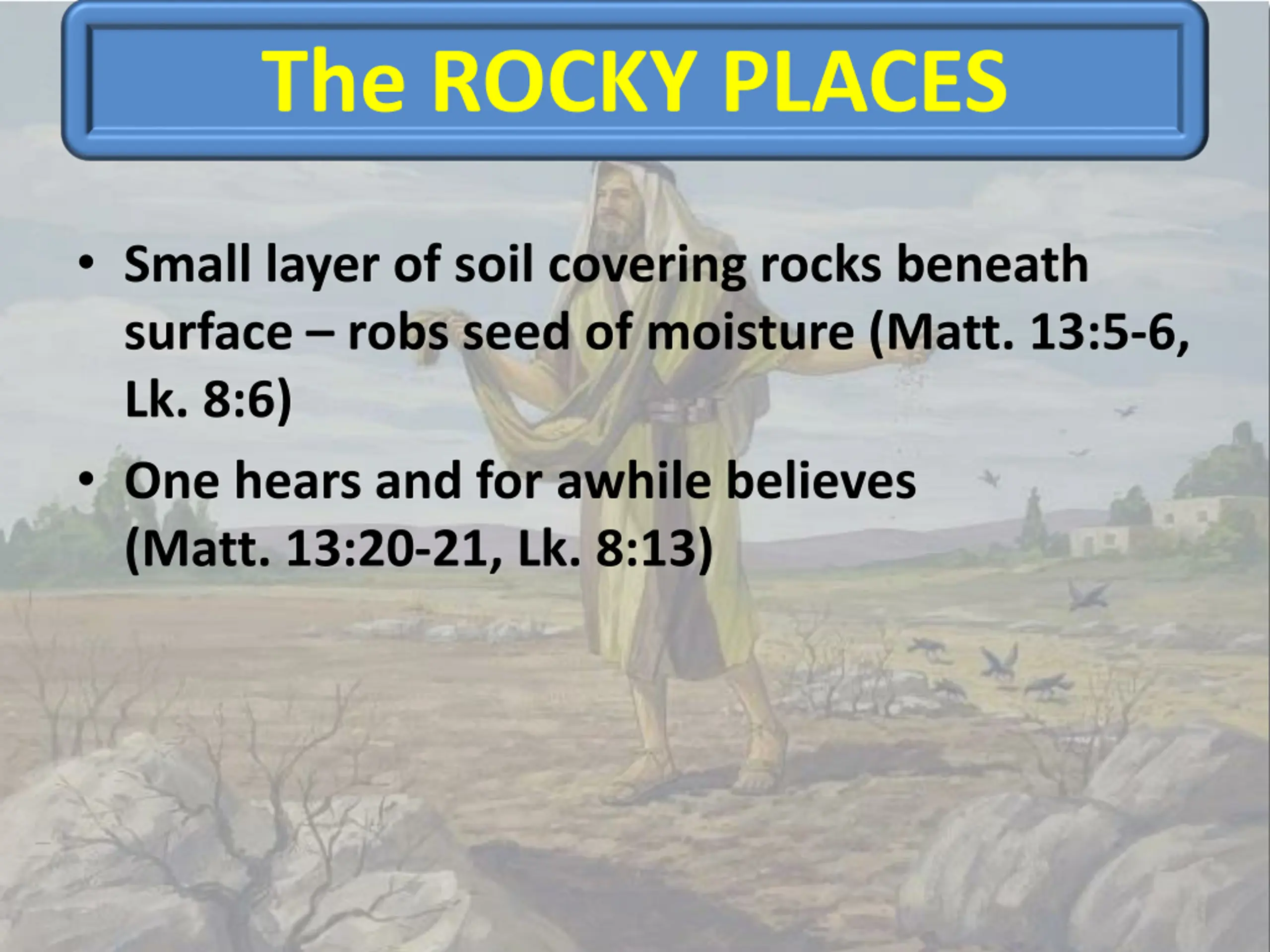 http://www.4kingdoms.com/sower.jpg The ROCKY PLACES Small layer of soil covering rocks beneath surface robs seed of moisture (Matt. 13:5-6, Lk. 8:6) One hears and for awhile believes (Matt. 13:20-21, Lk. 8:13)