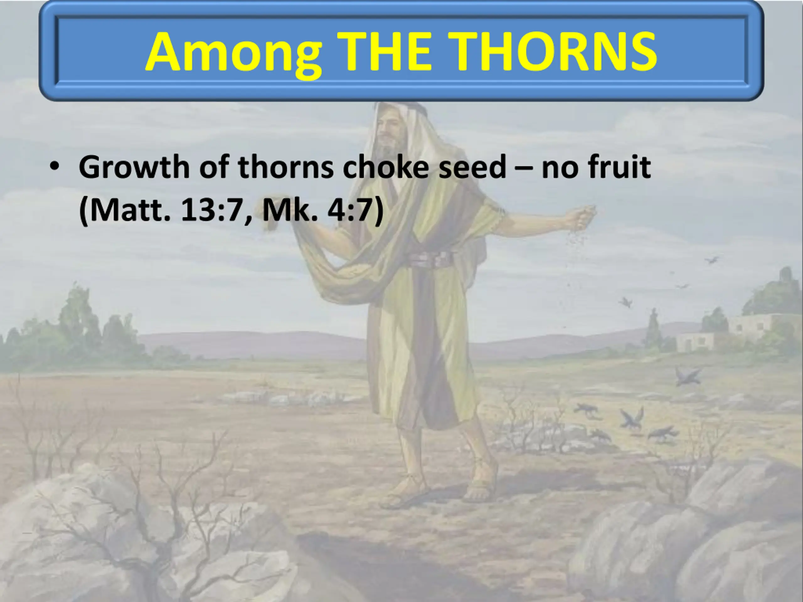 http://www.4kingdoms.com/sower.jpg Among THE THORNS Growth of thorns choke seed no fruit (Matt. 13:7, Mk. 4:7) Care of world deceitfulness of riches person not fruitful (Matt. 13:22) the cares of the world deceitfulness of riches lusts of other things entering in seed becomes unfruitful (Mk. 4:19) Cares Riches pleasures of this life - no fruit unto perfection (Lk. 8:14)