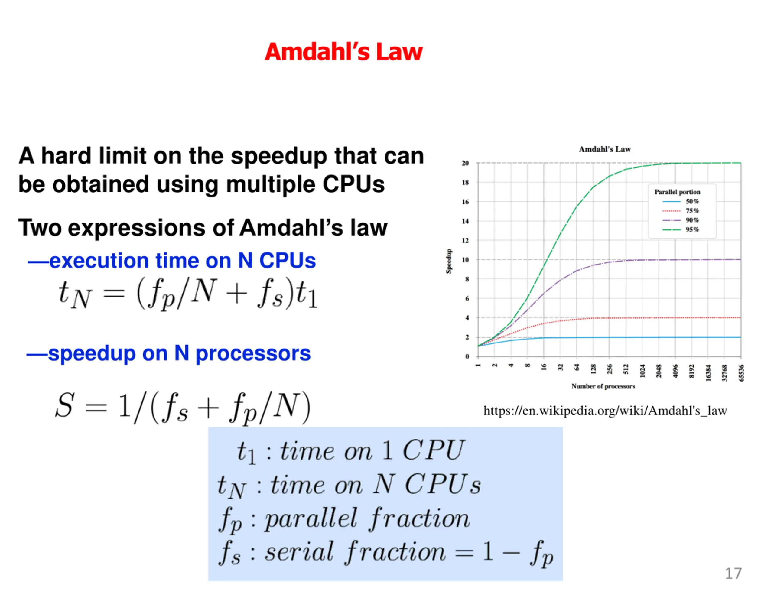 Amdahls Law A hard limit on the speedup that can be obtained using multiple CPUs Two expressions of Amdahl s law execution time on N CPUs speedup on N processors https://en.wikipedia.org/wiki/Amdahl's_law 17