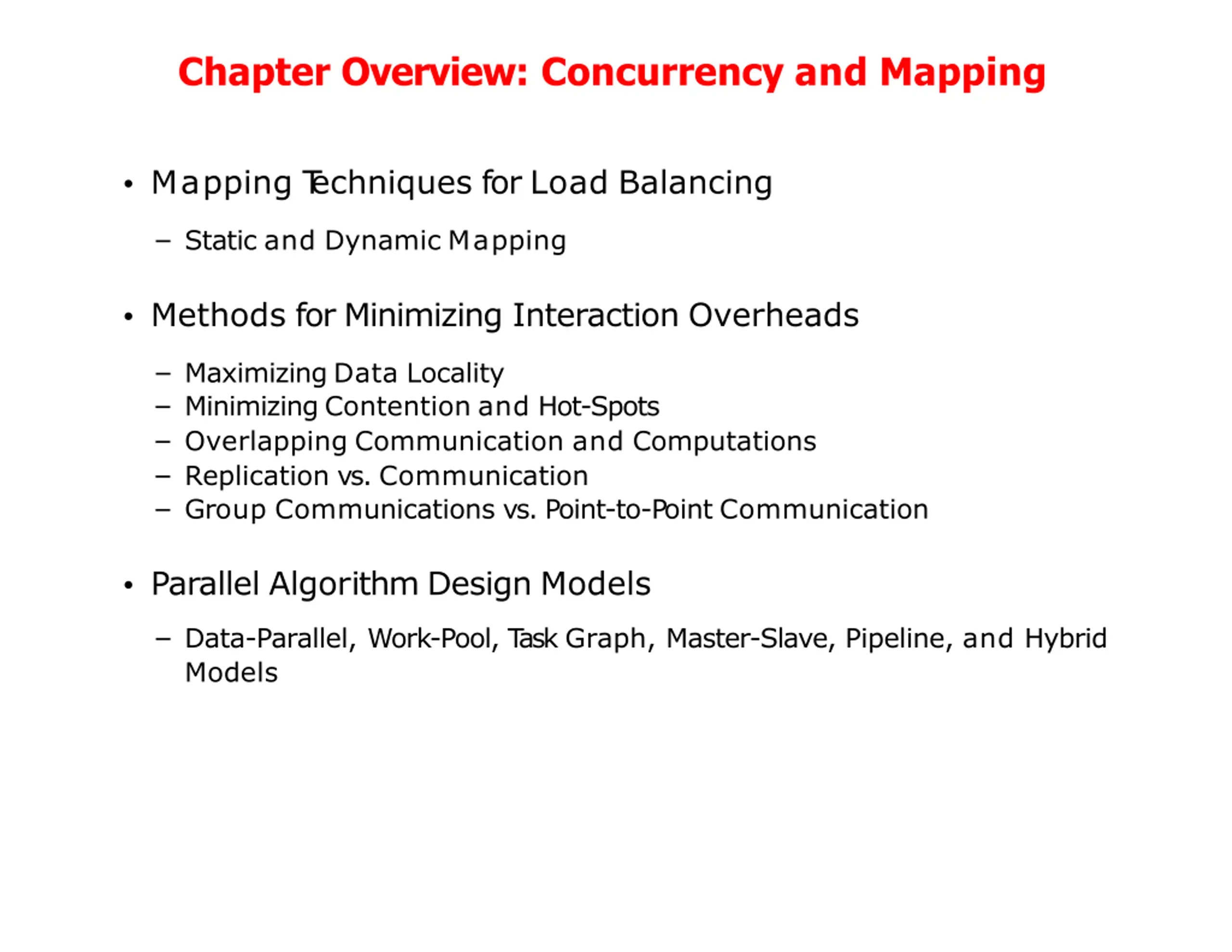 Chapter Overview: Concurrency and Mapping Mapping T echniques for Load Balancing Static and Dynamic Mapping Methods for Minimizing Interaction Overheads Maximizing Data Locality Minimizing Contention and Hot-Spots Overlapping Communication and Computations Replication vs. Communication Group Communications vs. Point-to-Point Communication Parallel Algorithm Design Models Data-Parallel, Work-Pool, T ask Graph, Master-Slave, Pipeline, and Hybrid Models