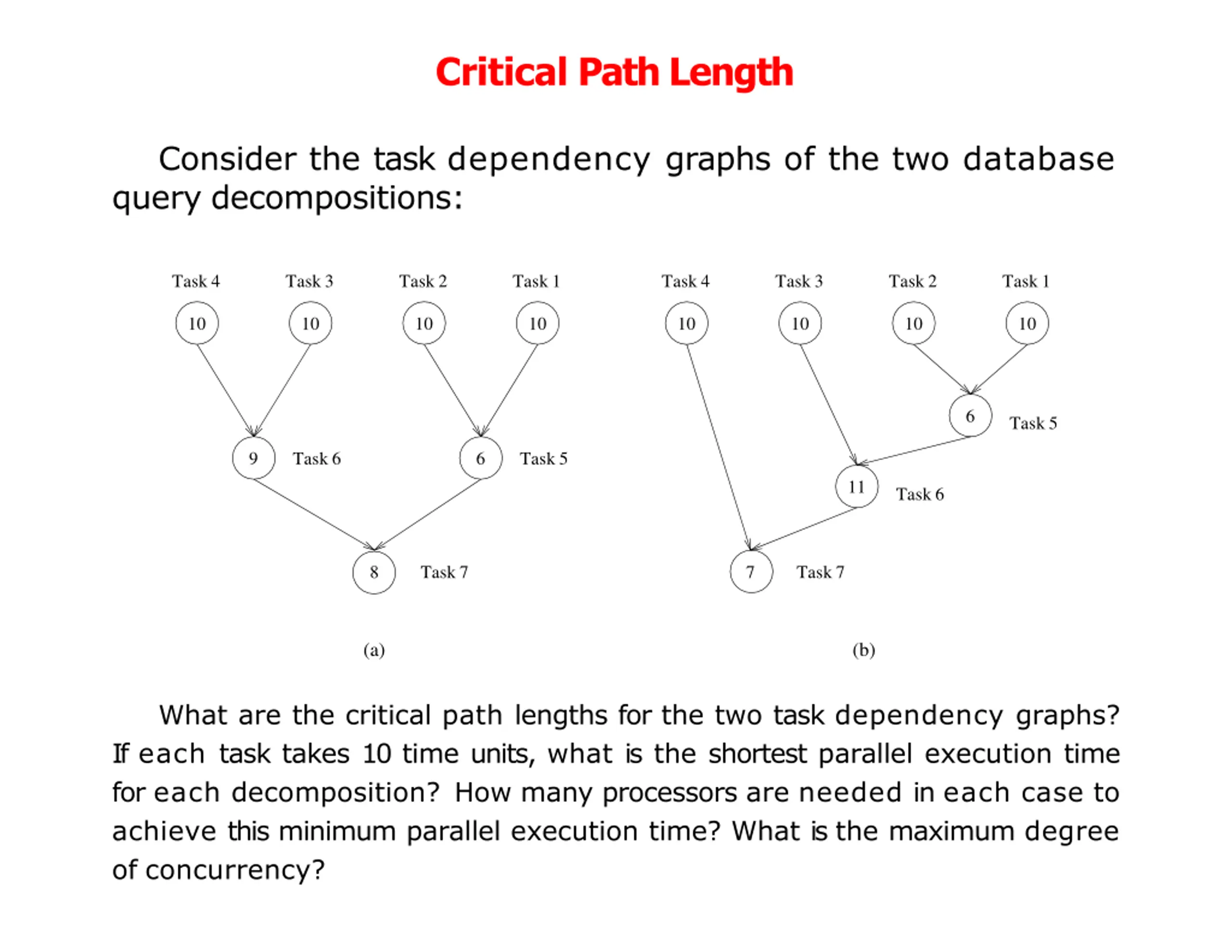 Critical Path Length Consider the task dependency graphs of the two database query decompositions: Task 4 Task 3 Task 2 Task 1 Task 4 Task 3 Task 2 Task 1 10 10 10 10 10 10 10 10 6 Task 5 9 Task 6 6 Task 5 11 Task 6 8 Task 7 7 Task 7 (a) (b) What are the critical path lengths for the two task dependency graphs? If each task takes 10 time units, what is the shortest parallel execution time for each decomposition? How many processors are needed in each case to achieve this minimum parallel execution time? What is the maximum degree of concurrency?