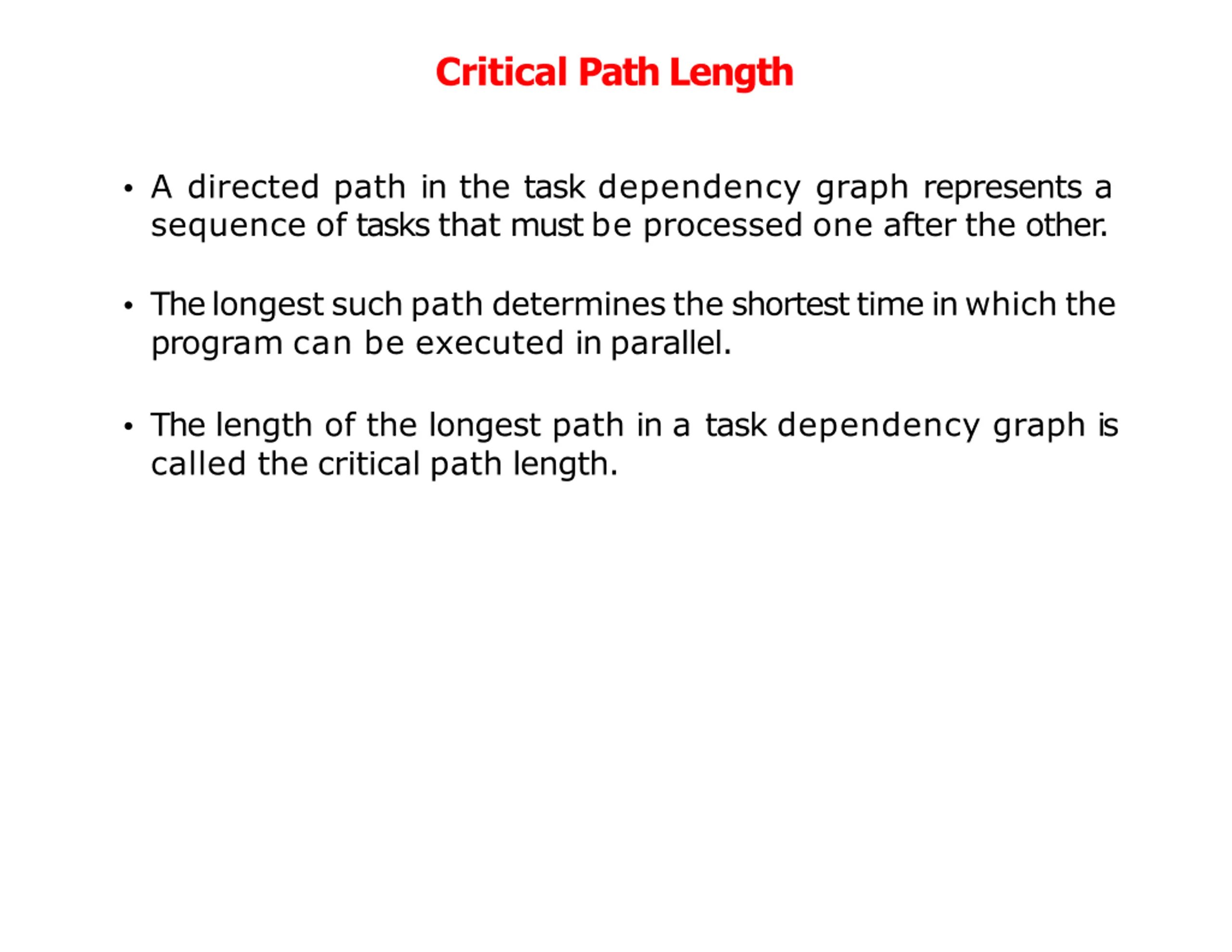 Critical Path Length A directed path in the task dependency graph represents a sequence of tasks that must be processed one after the other. Thelongest such path determines the shortesttime inwhich the program can be executed in parallel. The length of the longest path in a task dependency graph is called the critical path length.