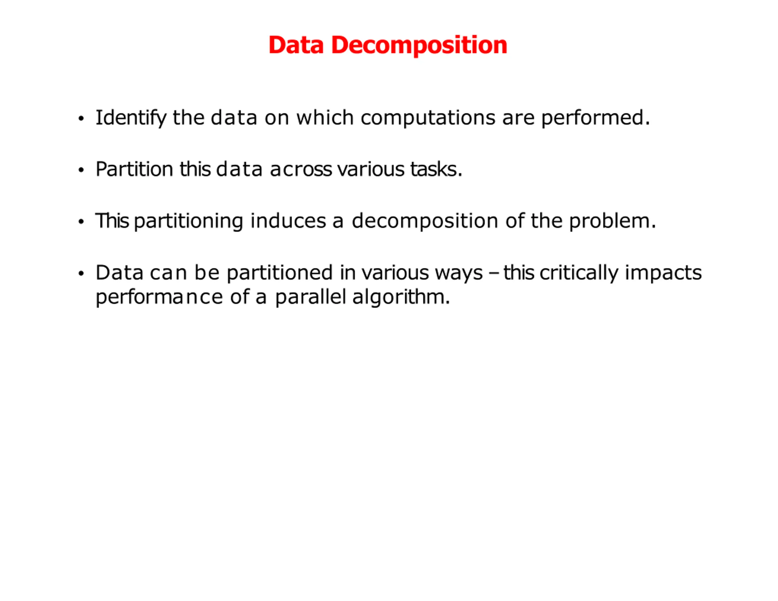 Data Decomposition Identify the data on which computations are performed. Partition this data acrossvarious tasks. Thispartitioning induces a decomposition of the problem. Data can be partitioned in various ways this critically impacts performance of a parallel algorithm.