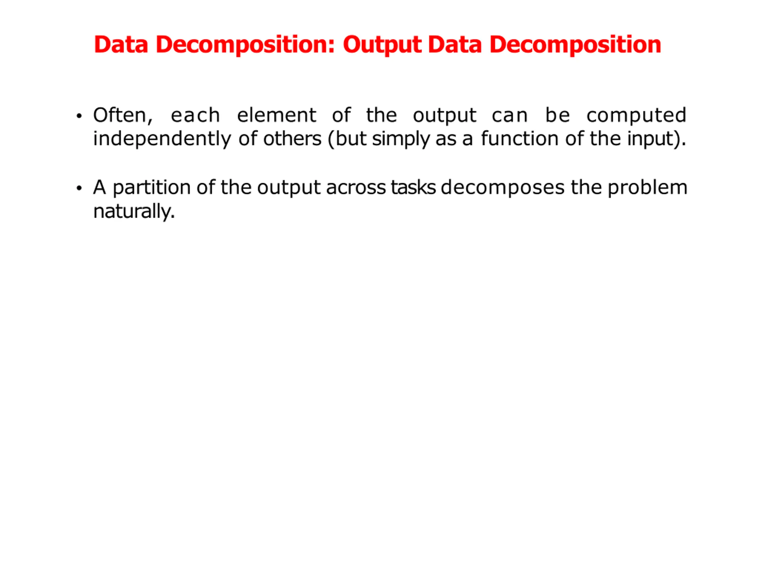 Data Decomposition: Output Data Decomposition Often, each element of the output can be computed independently of others (but simply as a function of the input). A partition of the output across tasksdecomposes the problem naturally.