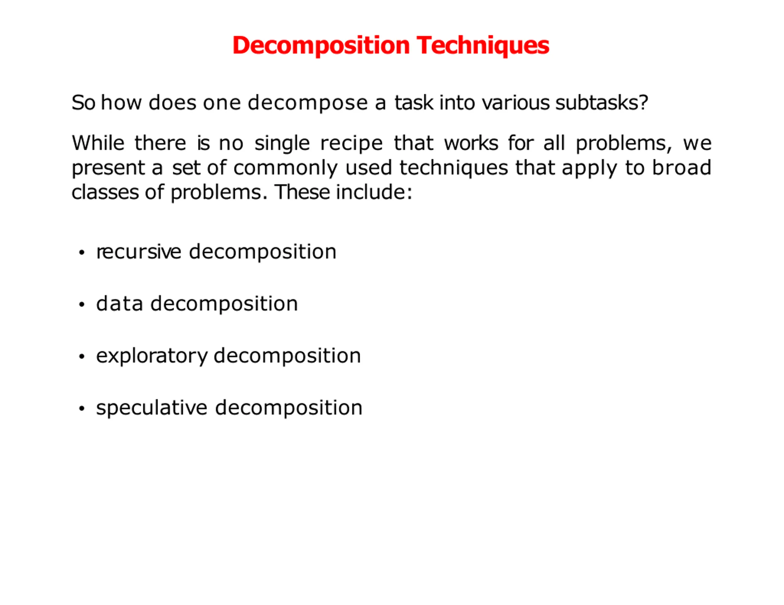 Decomposition Techniques So how does one decompose a task into various subtasks? While there is no single recipe that works for all problems, we present a set of commonly used techniques that apply to broad classes of problems. These include: recursive decomposition data decomposition exploratory decomposition speculative decomposition