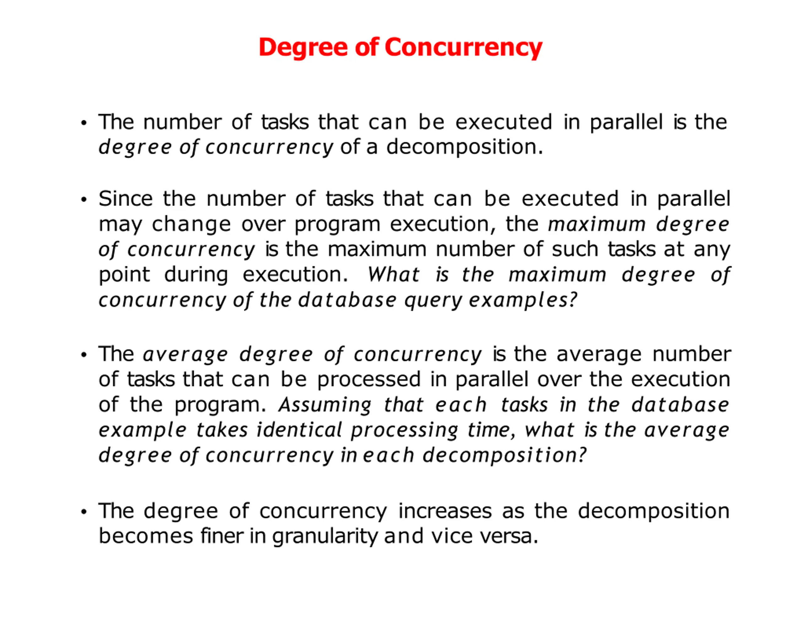 Degree of Concurrency The number of tasks that can be executed in parallel is the degree of concurrency of a decomposition. Since the number of tasks that can be executed in parallel may change over program execution, the maximum degree of concurrency is the maximum number of such tasks at any point during execution. What is the maximum degree of concurrency of the database query examples? The average degree of concurrency is the average number of tasks that can be processed in parallel over the execution of the program. Assuming that each tasks in the database example takes identical processing time, what is the average degree of concurrency in each decomposition? The degree of concurrency increases as the decomposition becomes finer in granularity and vice versa.