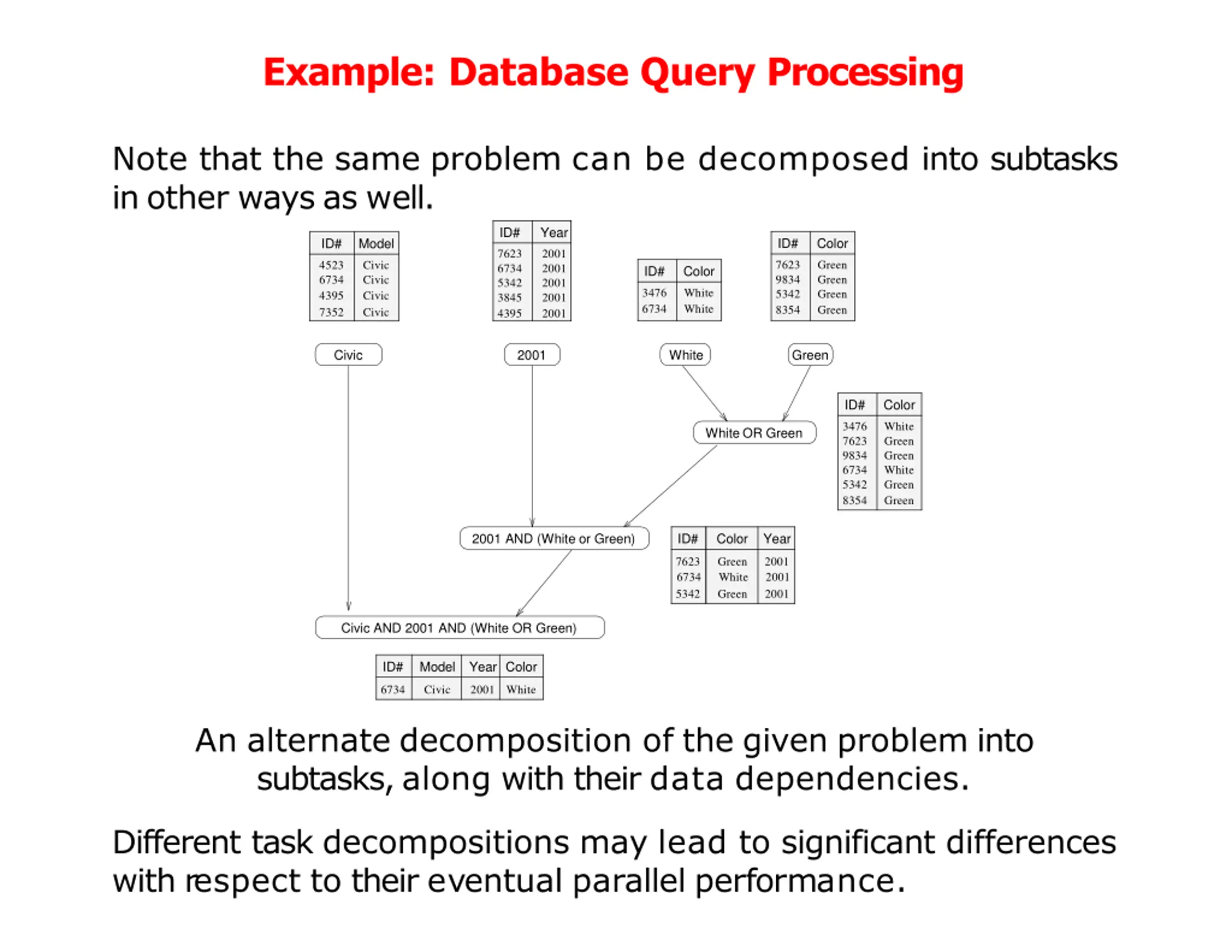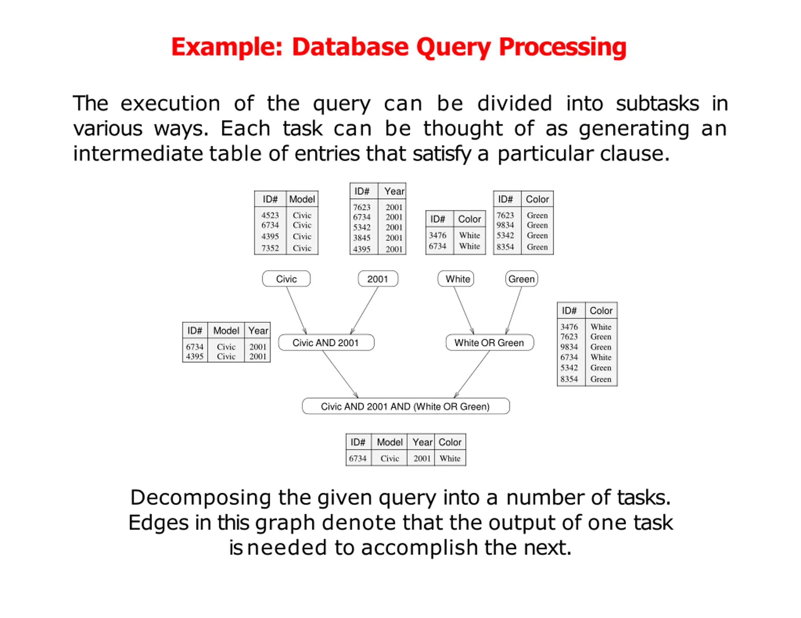Example: Database Query Processing The execution of the query can be divided into subtasks in various ways. Each task can be thought of as generating an intermediate table of entries that satisfy a particular clause. ID# Year ID# Model ID# Color 7623 6734 5342 3845 4395 2001 2001 2001 2001 2001 4523 6734 4395 7352 Civic Civic Civic Civic 7623 9834 5342 8354 Green Green Green Green ID# Color 3476 6734 White White Civic 2001 White Green ID# Color 3476 7623 9834 6734 5342 8354 White Green Green White Green Green ID# Model Year Civic AND 2001 WhiteOR Green 6734 4395 Civic Civic 2001 2001 Civic AND 2001 AND (White OR Green) ID# Model Year Color 6734 Civic 2001 White Decomposing the given query into a number of tasks. Edges in this graph denote that the output of one task isneeded to accomplish the next.
