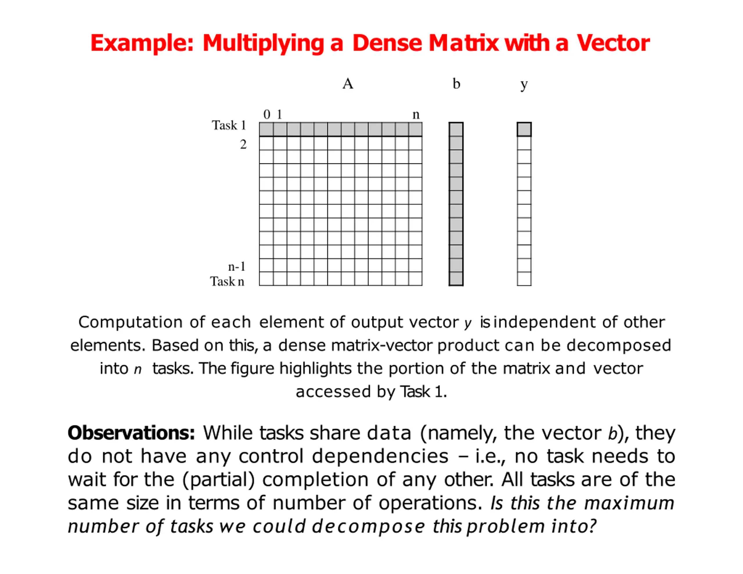Example: Multiplying a Dense Matrix with a Vector A b y n 0 1 Task1 2 n-1 Taskn Computation of each element of output vector y is independent of other elements. Based on this, a dense matrix-vector product can be decomposed into n tasks. The figure highlights the portion of the matrix and vector accessed by T ask1. Observations: While tasks share data (namely, the vector b), they do not have any control dependencies i.e., no task needs to wait for the (partial) completion of any other. All tasks are of the same size in terms of number of operations. Is this the maximum number of tasks we could decompose this problem into?