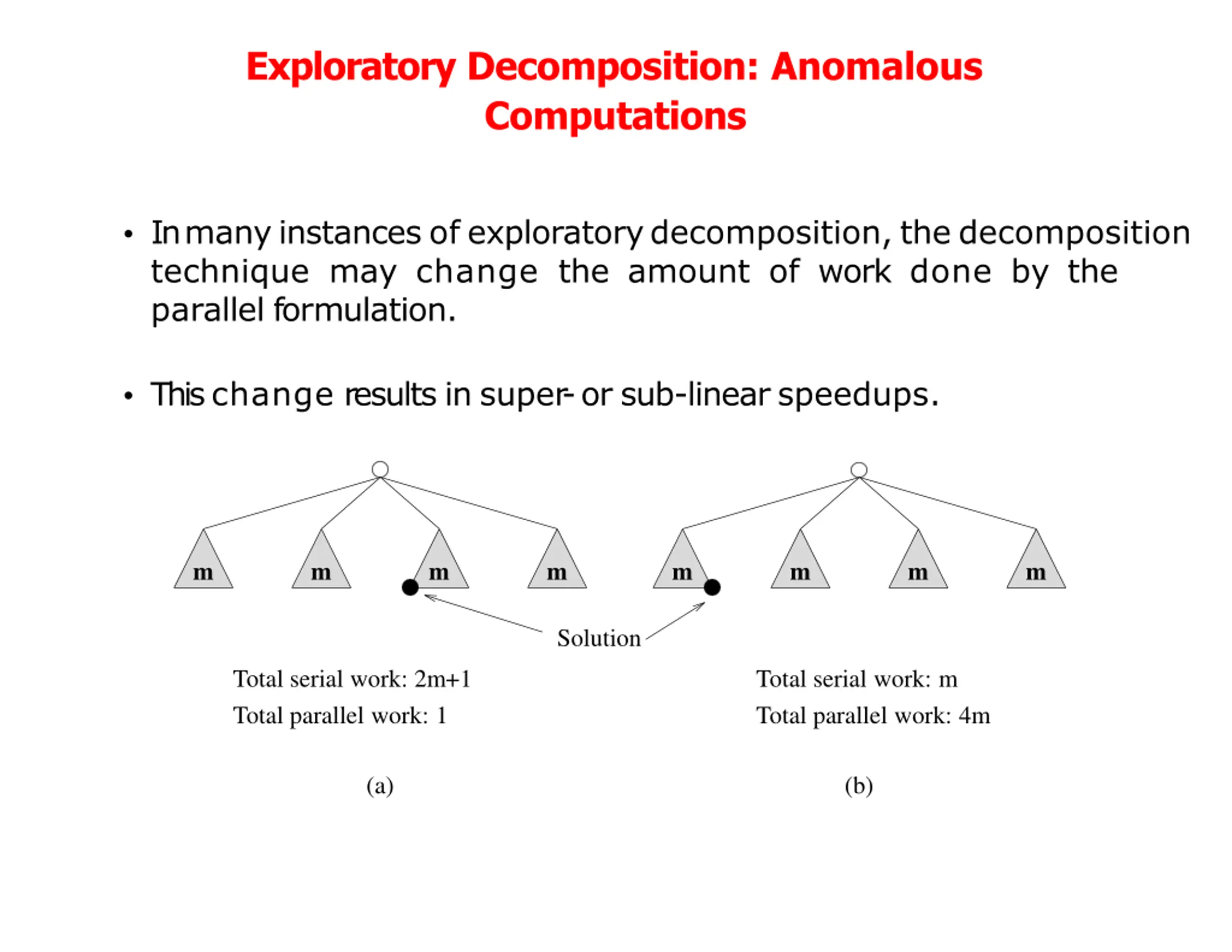 Exploratory Decomposition: Anomalous Computations Inmany instances of exploratorydecomposition, the decomposition technique may change the amount of work done by the parallel formulation. Thischange results in super -or sub-linear speedups. m m m m m m m m Solution Total serial work: 2m+1 Total parallel work: 1 Total serial work: m Total parallel work: 4m (a) (b)