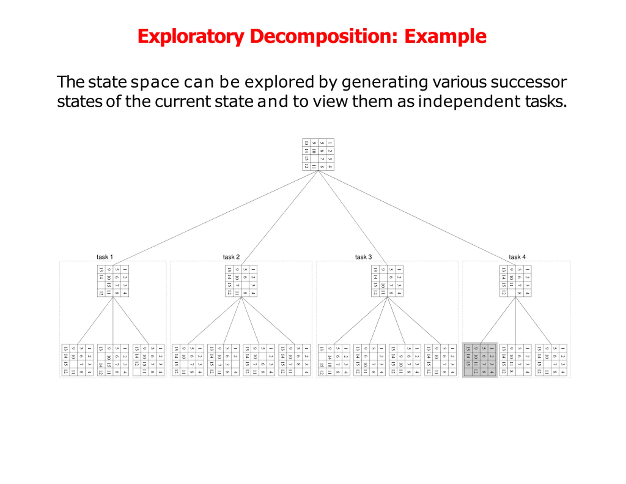 Exploratory Decomposition: Example Thestatespace can be explored by generating various successor statesof the currentstateand to view them asindependent tasks. 13 14 15 12 9 5 1 10 6 2 7 3 11 8 4 task 1 task 2 task 3 task 4 13 14 13 14 15 12 13 14 15 12 13 14 15 12 9 5 1 9 5 1 9 5 1 9 5 1 10 15 11 10 10 11 6 7 8 2 3 4 6 2 6 7 2 3 6 2 10 11 7 8 3 4 7 3 12 11 8 4 8 4 13 14 15 12 13 13 14 12 13 14 15 12 13 14 15 12 13 14 15 12 13 14 15 12 13 13 14 15 12 13 14 15 12 13 14 15 12 13 14 15 13 14 15 12 13 14 15 12 9 5 1 9 5 1 9 5 1 9 5 1 9 5 1 9 5 1 9 5 1 9 5 1 9 5 1 9 5 1 9 5 1 9 5 1 9 5 1 5 6 1 2 10 10 15 11 10 10 10 10 10 10 11 12 10 11 8 10 10 15 11 14 10 11 6 2 6 7 8 2 3 4 6 2 6 2 6 2 6 2 6 7 8 2 3 4 6 7 2 3 4 6 2 2 6 2 9 6 7 8 2 3 4 6 7 8 2 3 4 10 11 10 11 14 12 15 12 7 8 3 4 7 8 3 4 7 3 7 3 7 6 3 7 11 8 3 4 7 3 7 3 3 8 7 11 11 11 11 11 11 8 4 8 4 8 4 8 4 8 4 4