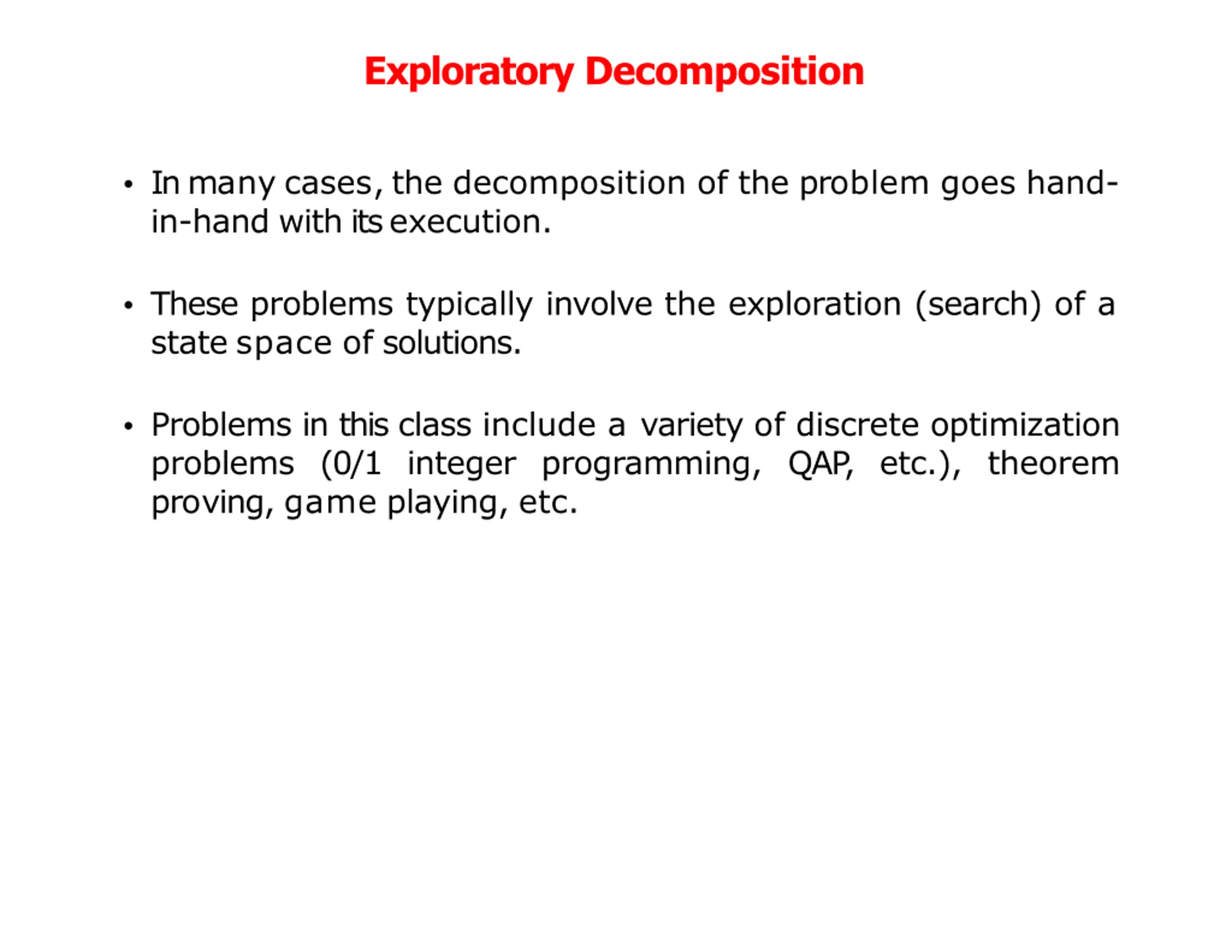 Exploratory Decomposition Inmany cases, the decomposition of the problem goes hand- in-hand with itsexecution. These problems typically involve the exploration (search) of a state space of solutions. Problems in this class include a variety of discrete optimization problems (0/1 integer programming, QAP, etc.), theorem proving, game playing, etc.