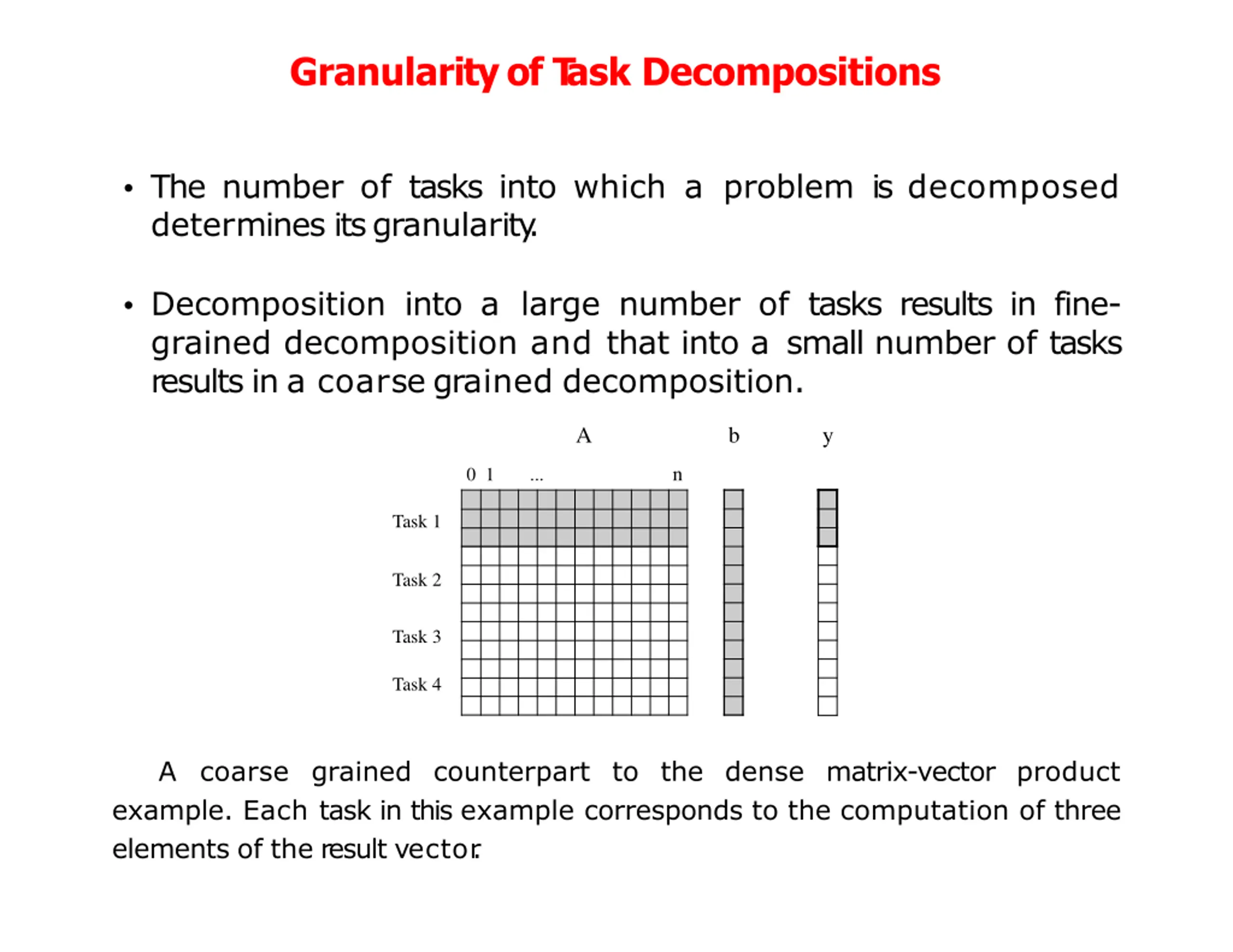 Granularityof T ask Decompositions The number of tasks into which a problem is decomposed determines itsgranularity . Decomposition into a large number of tasks results in fine- grained decomposition and that into a small number of tasks results in a coarse grained decomposition. A b y n 0 1 ... Task 1 Task 2 Task 3 Task 4 A coarse grained counterpart to the dense matrix-vector product example. Each task in this example corresponds to the computation of three elements of the result vector .