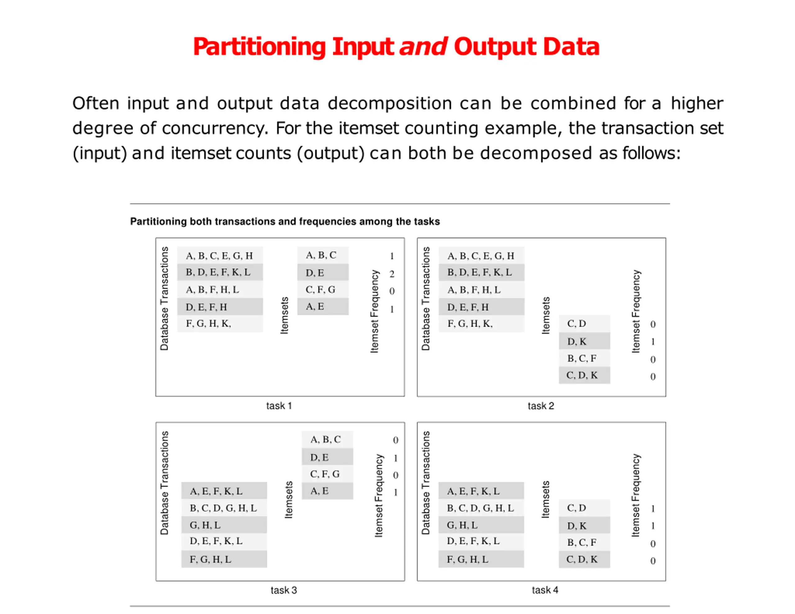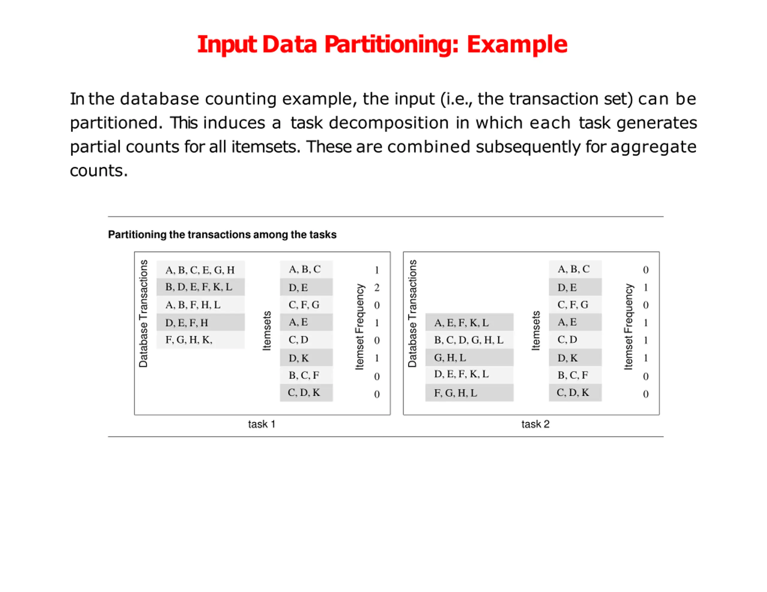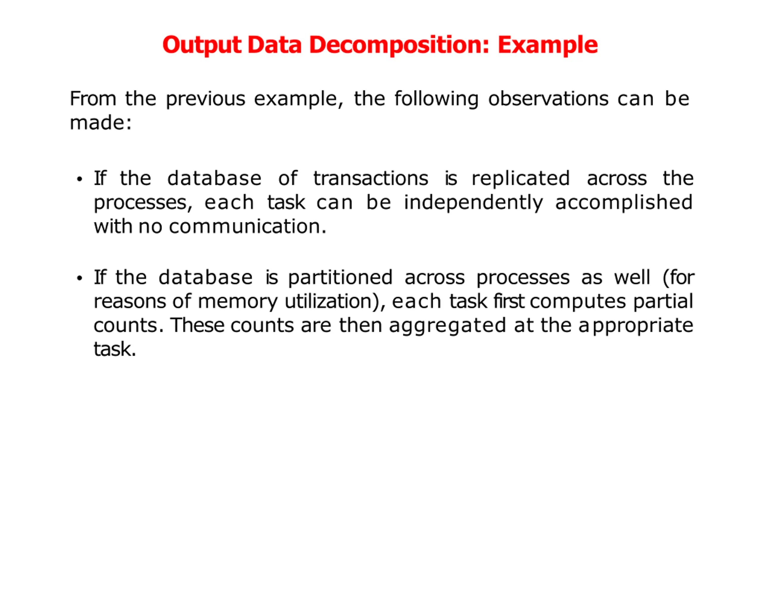 Output Data Decomposition: Example From the previous example, the following observations can be made: If the database of transactions is replicated across the processes, each task can be independently accomplished with no communication. If the database is partitioned across processes as well (for reasons of memory utilization), each task first computes partial counts. These counts are then aggregated at the appropriate task.