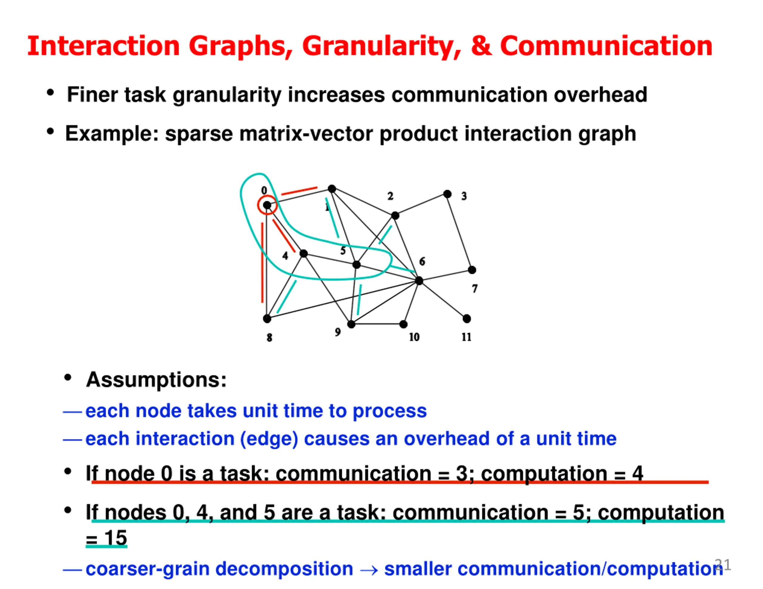 Interaction Graphs, Granularity, & Communication Finer task granularity increases communication overhead Example: sparse matrix-vector product interaction graph Assumptions: each node takes unit time to process each interaction (edge) causes an overhead of a unit time If node 0 is a task: communication = 3; computation = 4 If nodes 0, 4, and 5 are a task: communication = 5; computation = 15 coarser-grain decomposition smaller communication/computation21
