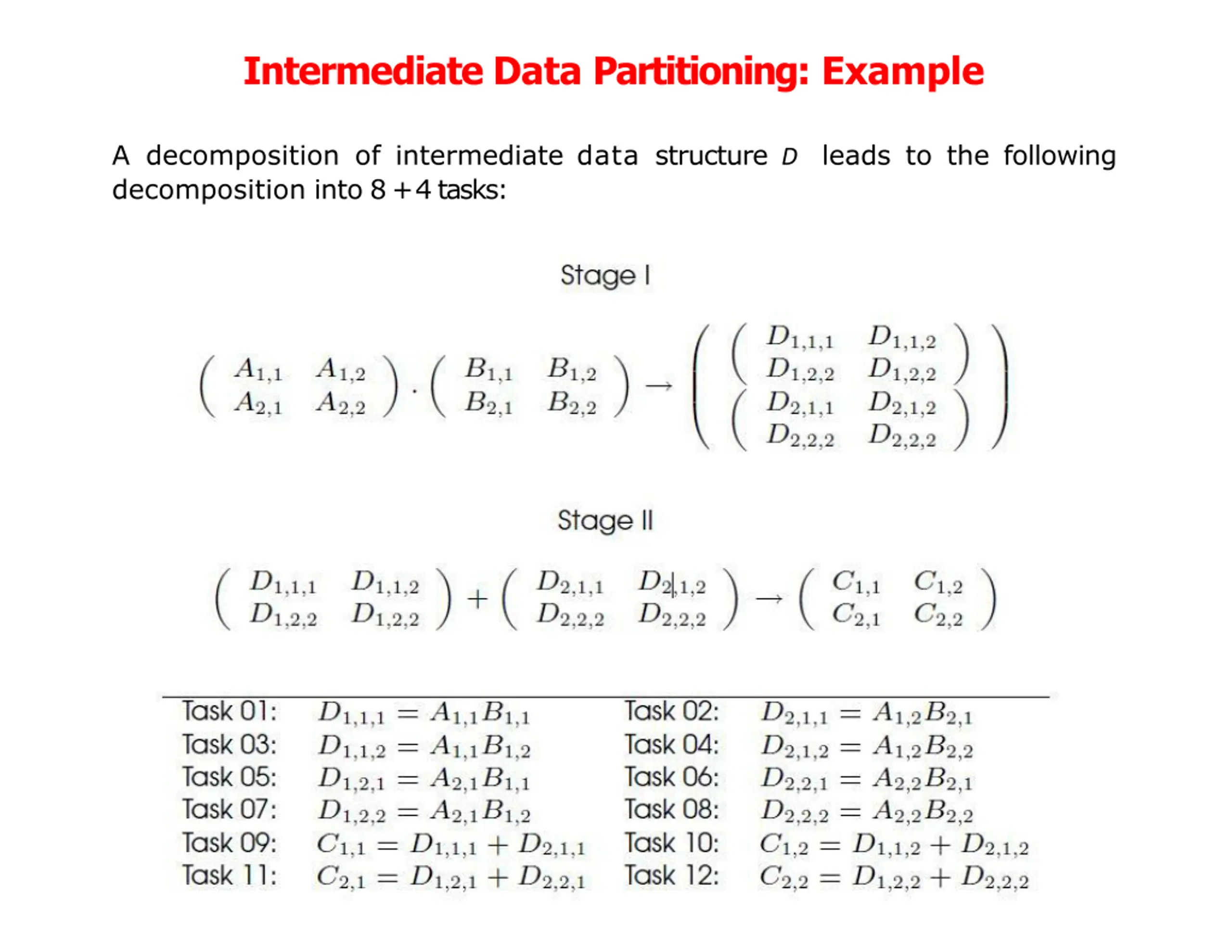 Intermediate Data Partitioning: Example Let us revisit the example of dense matrix multiplication. We first show how we can visualize this computation in terms of intermediate matrices D. . A1,1 B1,1 B1,2 D1,1,2 D1,1,1 A2,1 D1,2,1 D1,2,2 + . A1,2 D2,1,1 D2,1,2 A2,2 B2,1 B2,2 D2,2,1 D2,2,2 C1,1 C1,2 C2,1 C2,2