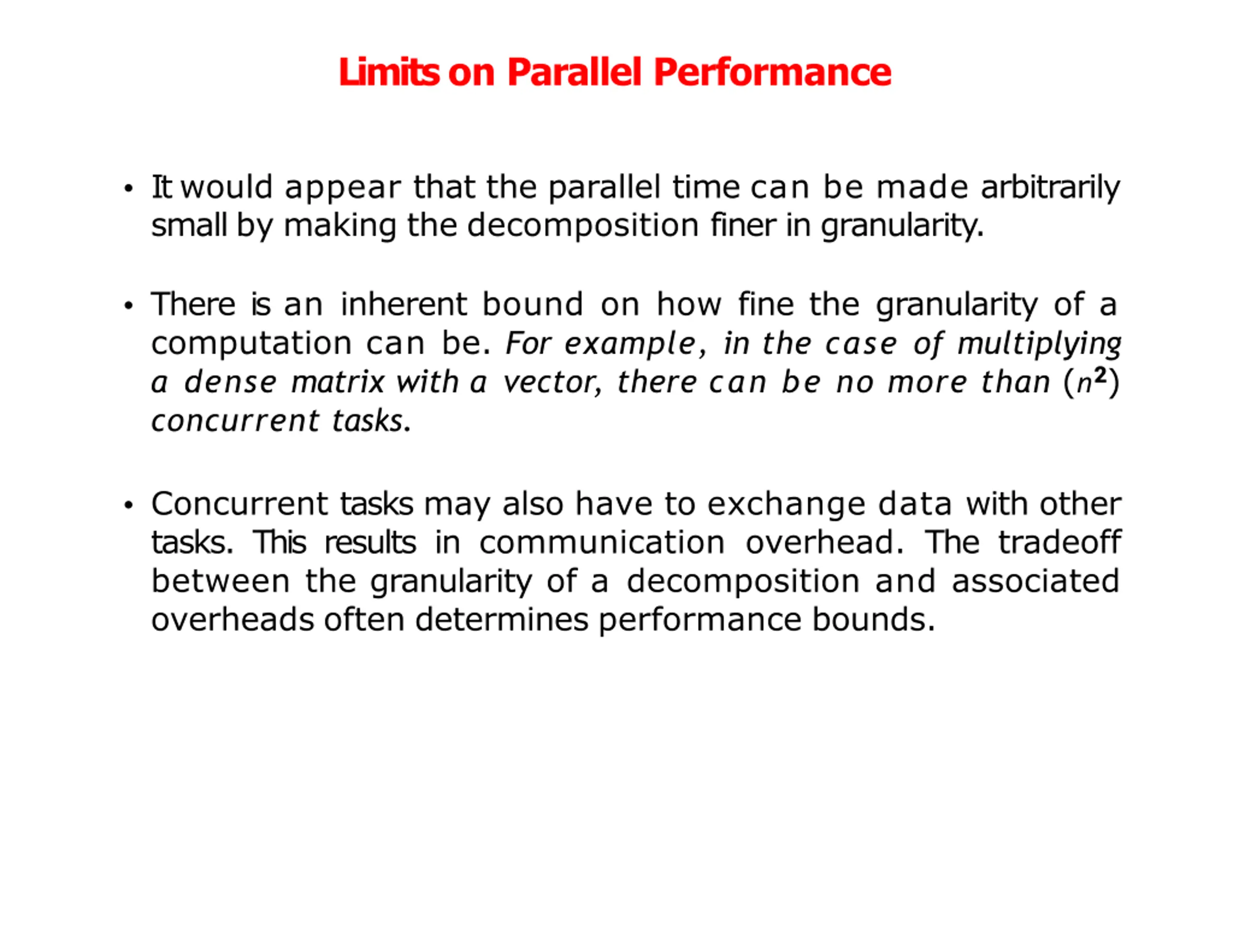 Limitson Parallel Performance It would appear that the parallel time can be made arbitrarily small by making the decomposition finer in granularity. There is an inherent bound on how fine the granularity of a computation can be. For example, in the case of multiplying a dense matrix with a vector, there can be no more than (n2) concurrent tasks. Concurrent tasks may also have to exchange data with other tasks. This results in communication overhead. The tradeoff between the granularity of a decomposition and associated overheads often determines performance bounds.