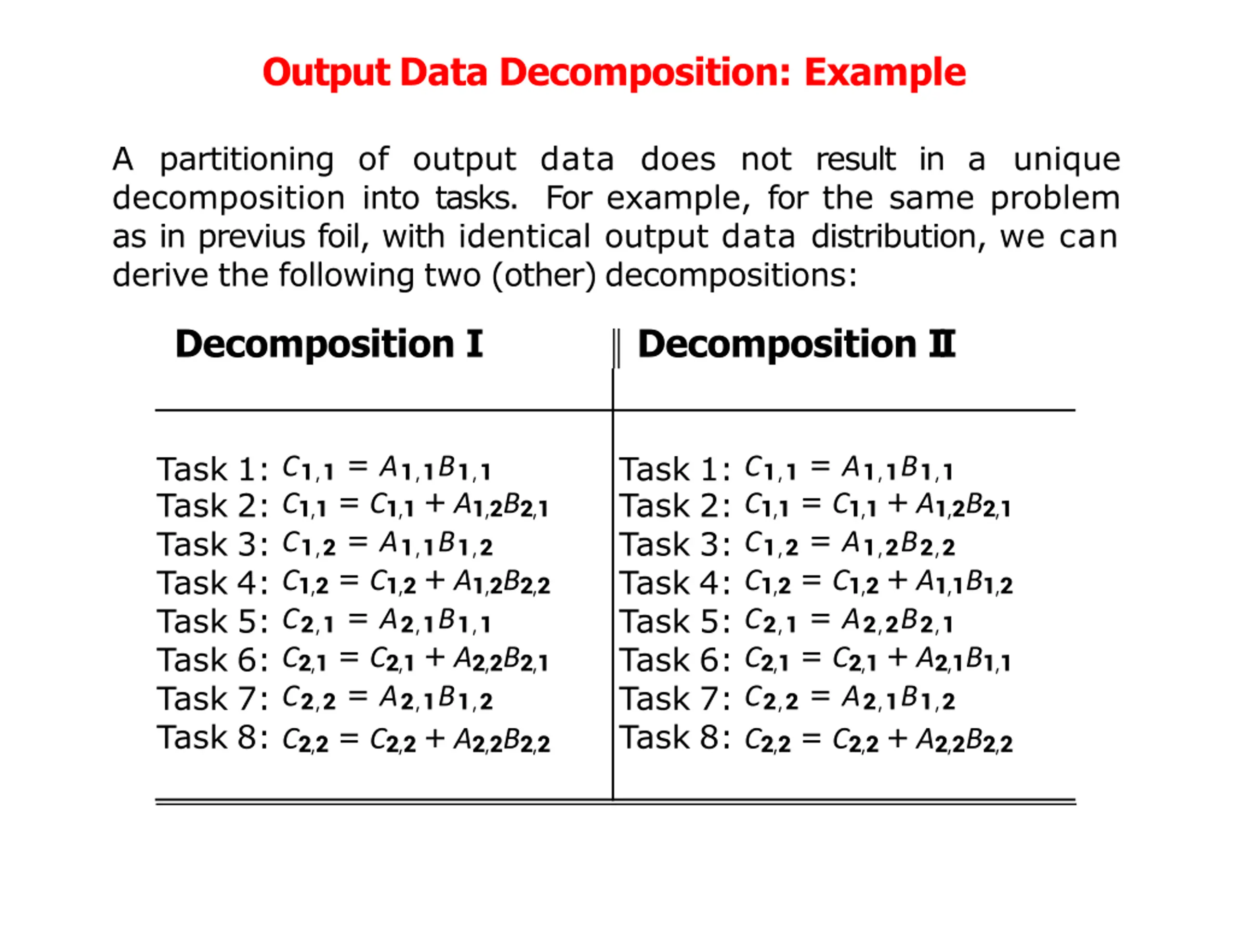Output Data Decomposition: Example A partitioning of output data does not result in a unique decomposition into tasks. For example, for the same problem as in previus foil, with identical output data distribution, we can derive the following two (other) decompositions: Decomposition I Decomposition II Task 1:C1,1= A1,1B1,1 Task 2:C1,1 = C1,1+ A1,2B2,1 Task 3:C1,2= A1,1B1,2 Task 4:C1,2 = C1,2+ A1,2B2,2 Task 5:C2,1= A2,1B1,1 Task 6:C2,1 = C2,1+ A2,2B2,1 Task 7:C2,2= A2,1B1,2 Task 8: C2,2 = C2,2+ A2,2B2,2 Task 1:C1,1= A1,1B1,1 Task 2:C1,1 = C1,1+ A1,2B2,1 Task 3:C1,2= A1,2B2,2 Task 4:C1,2 = C1,2+ A1,1B1,2 Task 5:C2,1= A2,2B2,1 Task 6:C2,1 = C2,1+ A2,1B1,1 Task 7:C2,2= A2,1B1,2 Task 8: C2,2 = C2,2+ A2,2B2,2