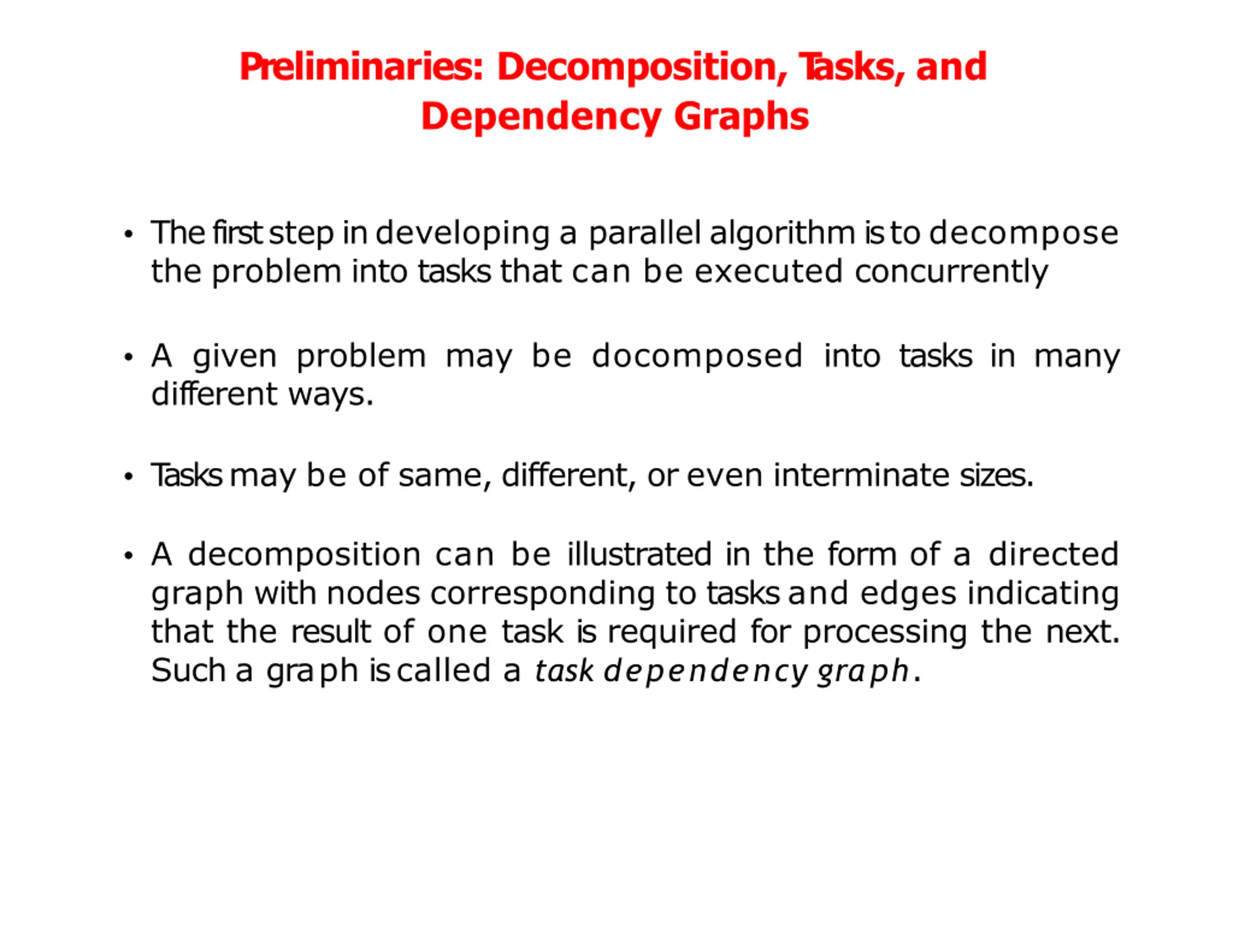 Preliminaries: Decomposition, T asks, and Dependency Graphs Thefirststep indeveloping a parallel algorithm isto decompose the problem into tasks that can be executed concurrently A given problem may be docomposed into tasks in many different ways. T asksmay be of same, different, or even interminate sizes. A decomposition can be illustrated in the form of a directed graph with nodes corresponding to tasks and edges indicating that the result of one task is required for processing the next. Such a graph iscalled a task dependency graph.