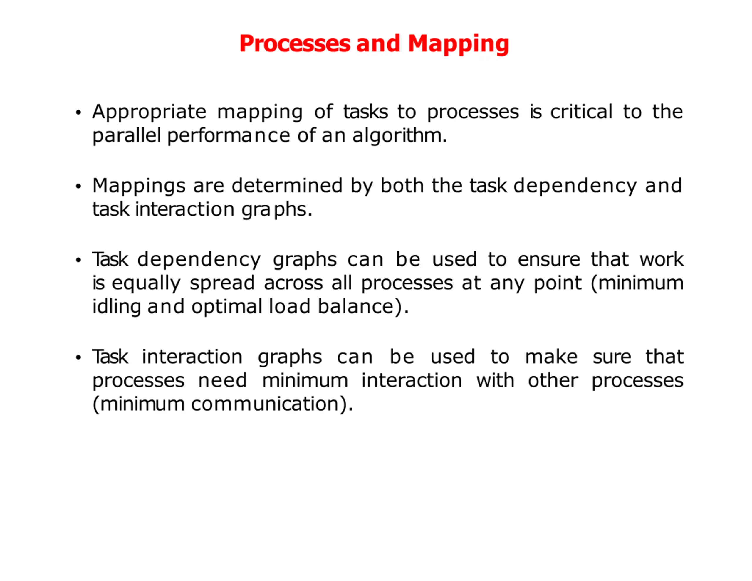 Processes and Mapping Appropriate mapping of tasks to processes is critical to the parallel performance of an algorithm. Mappings are determined by both the task dependency and task interaction graphs. T ask dependency graphs can be used to ensure that work is equally spread across all processes at any point (minimum idling and optimal load balance). T ask interaction graphs can be used to make sure that processes need minimum interaction with other processes (minimum communication).