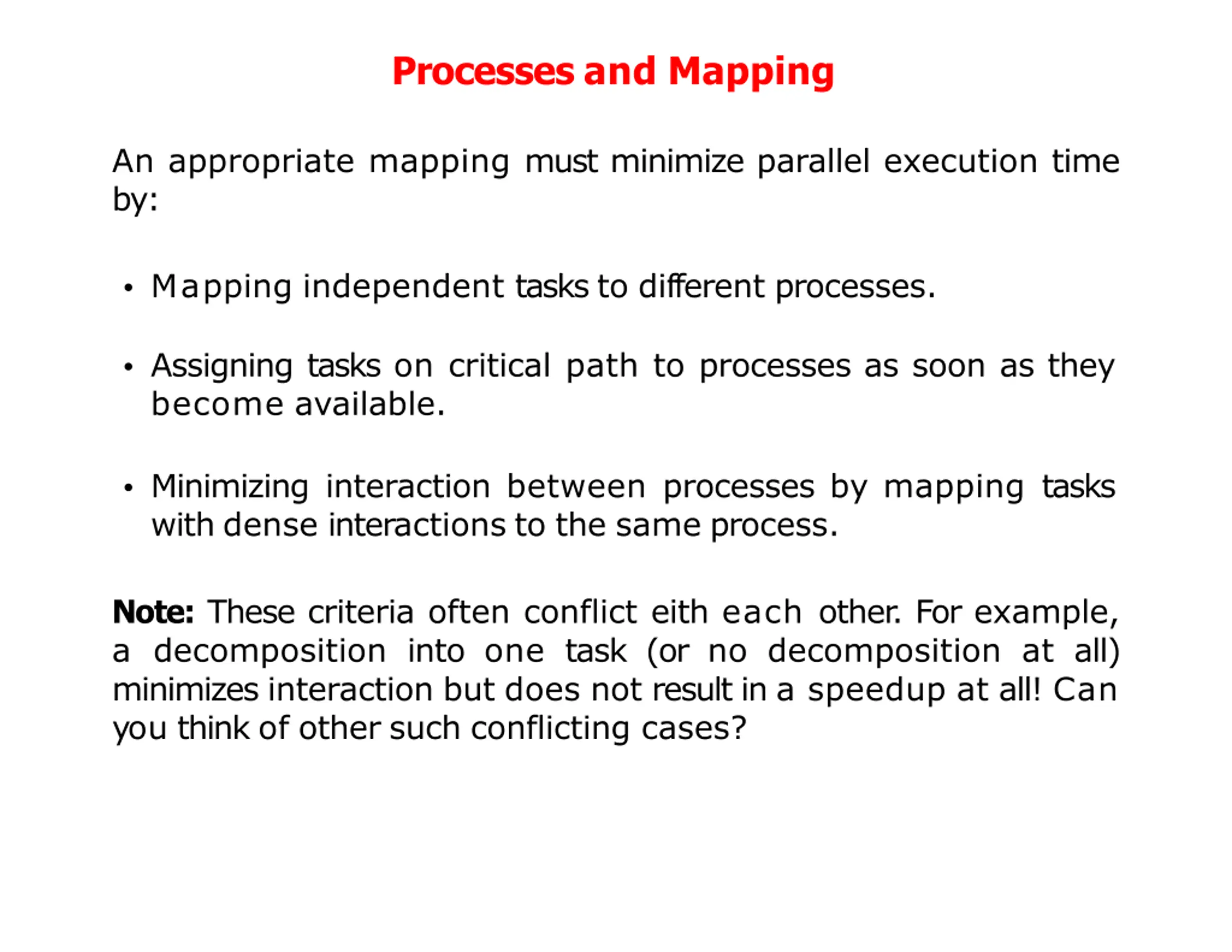 Processes and Mapping An appropriate mapping must minimize parallel execution time by: Mapping independent tasks to different processes. Assigning tasks on critical path to processes as soon as they become available. Minimizing interaction between processes by mapping tasks with dense interactions to the same process. Note: These criteria often conflict eith each other. For example, a decomposition into one task (or no decomposition at all) minimizes interaction but does not result in a speedup at all! Can you think of other such conflicting cases?