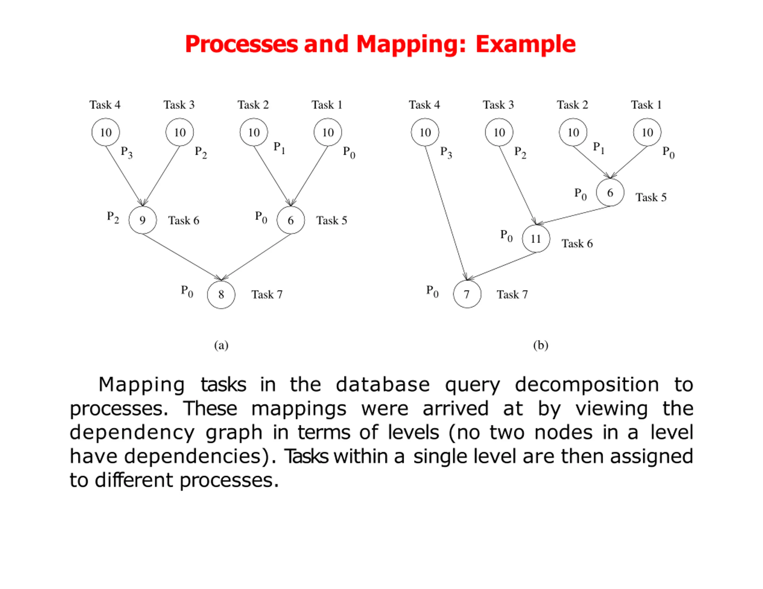 Processes and Mapping: Example Task 4 Task 3 Task 2 Task 1 Task 4 Task 3 Task 2 Task 1 10 10 10 10 10 10 10 10 P1 P1 P3 P2 P0 P0 P3 P2 P0 6 Task 5 P0 P2 9 Task 6 6 Task 5 P0 11 Task 6 P0 P0 8 Task 7 7 Task 7 (a) (b) Mapping tasks in the database query decomposition to processes. These mappings were arrived at by viewing the dependency graph in terms of levels (no two nodes in a level have dependencies). T askswithin a single level are then assigned to different processes.