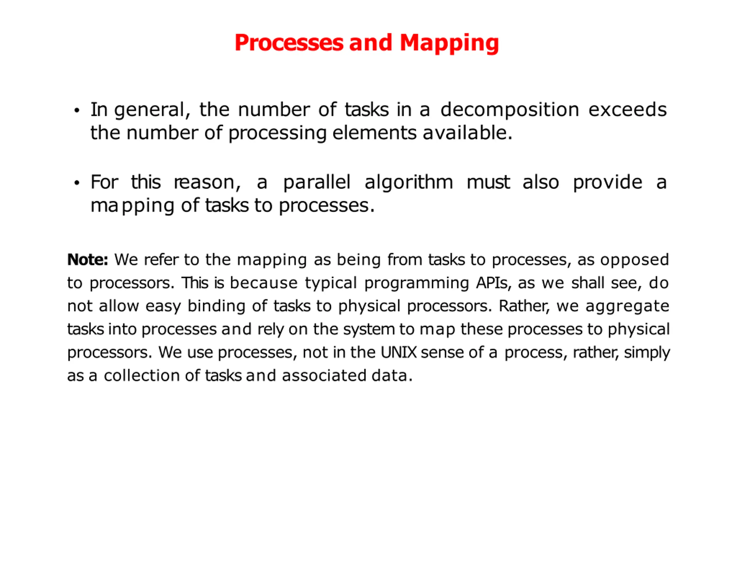 Processes and Mapping In general, the number of tasks in a decomposition exceeds the number of processing elements available. For this reason, a parallel algorithm must also provide a mapping of tasks to processes. Note: We refer to the mapping as being from tasks to processes, as opposed to processors. This is because typical programming APIs, as we shall see, do not allow easy binding of tasks to physical processors. Rather, we aggregate tasks into processes and rely on the system to map these processes to physical processors. We use processes, not in the UNIX sense of a process, rather, simply as a collection of tasks and associated data.