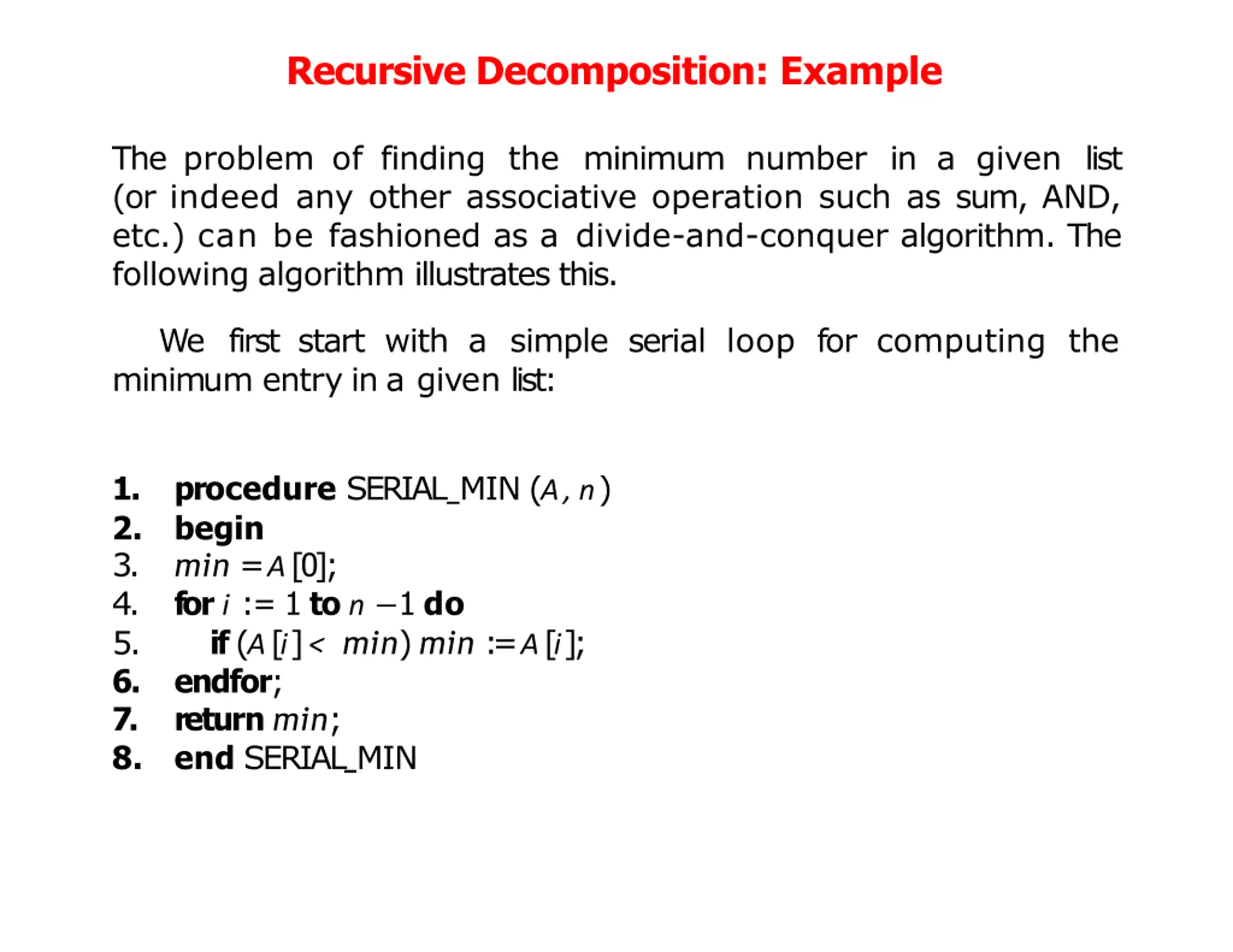 Recursive Decomposition: Example The problem of finding the minimum number in a given list (or indeed any other associative operation such as sum, AND, etc.) can be fashioned as a divide-and-conquer algorithm. The following algorithm illustrates this. We first start with a simple serial loop for computing the minimum entry in a given list: procedure SERIAL MIN (A, n) begin min =A[0]; for i := 1 to n 1 do 1. 2. 3. 4. 5. 6. 7. 8. if(A[i]< min)min :=A[i]; endfor; return min; end SERIAL MIN
