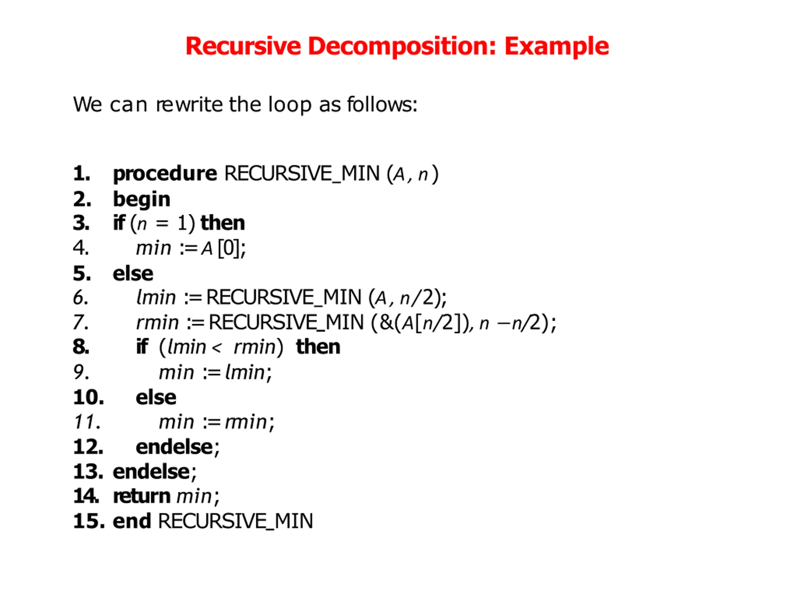 Recursive Decomposition: Example We can rewrite the loop as follows: procedure RECURSIVE MIN (A, n) begin if(n = 1)then min :=A[0]; else lmin :=RECURSIVE MIN (A, n/2); rmin :=RECURSIVE MIN (&(A[n/2]),n n/2); if (lmin < rmin) then min :=lmin; else min :=rmin; endelse; 1. 2. 3. 4. 5. 6. 7. 8. 9. 10. 11. 12. 13. endelse; 14. return min; 15. end RECURSIVE MIN