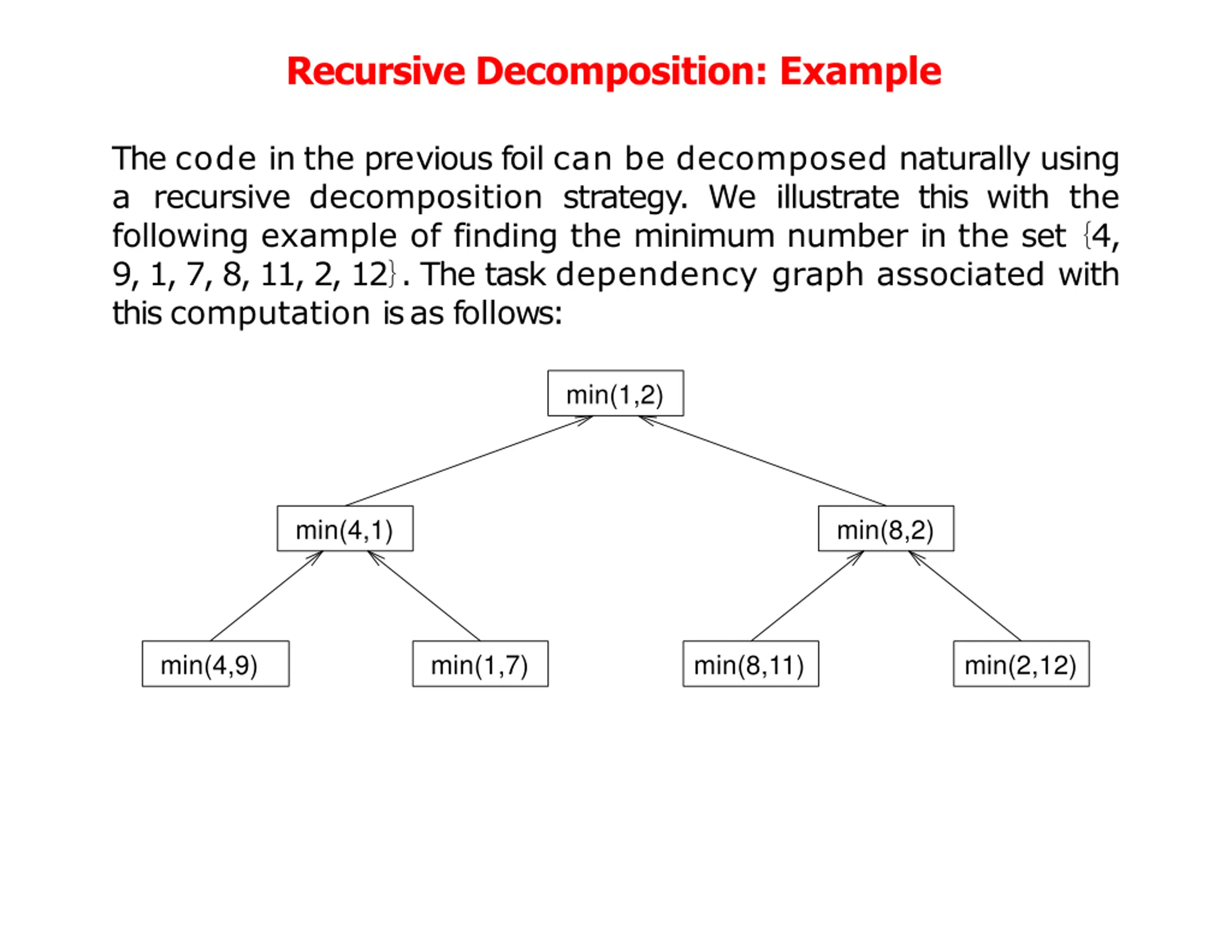 Recursive Decomposition: Example The code in the previous foil can be decomposed naturally using a recursive decomposition strategy. We illustrate this with the following example of finding the minimum number in the set {4, 9, 1, 7, 8, 11, 2, 12}. The task dependency graph associated with this computation isas follows: min(1,2) min(4,1) min(8,2) min(4,9) min(1,7) min(8,11) min(2,12)
