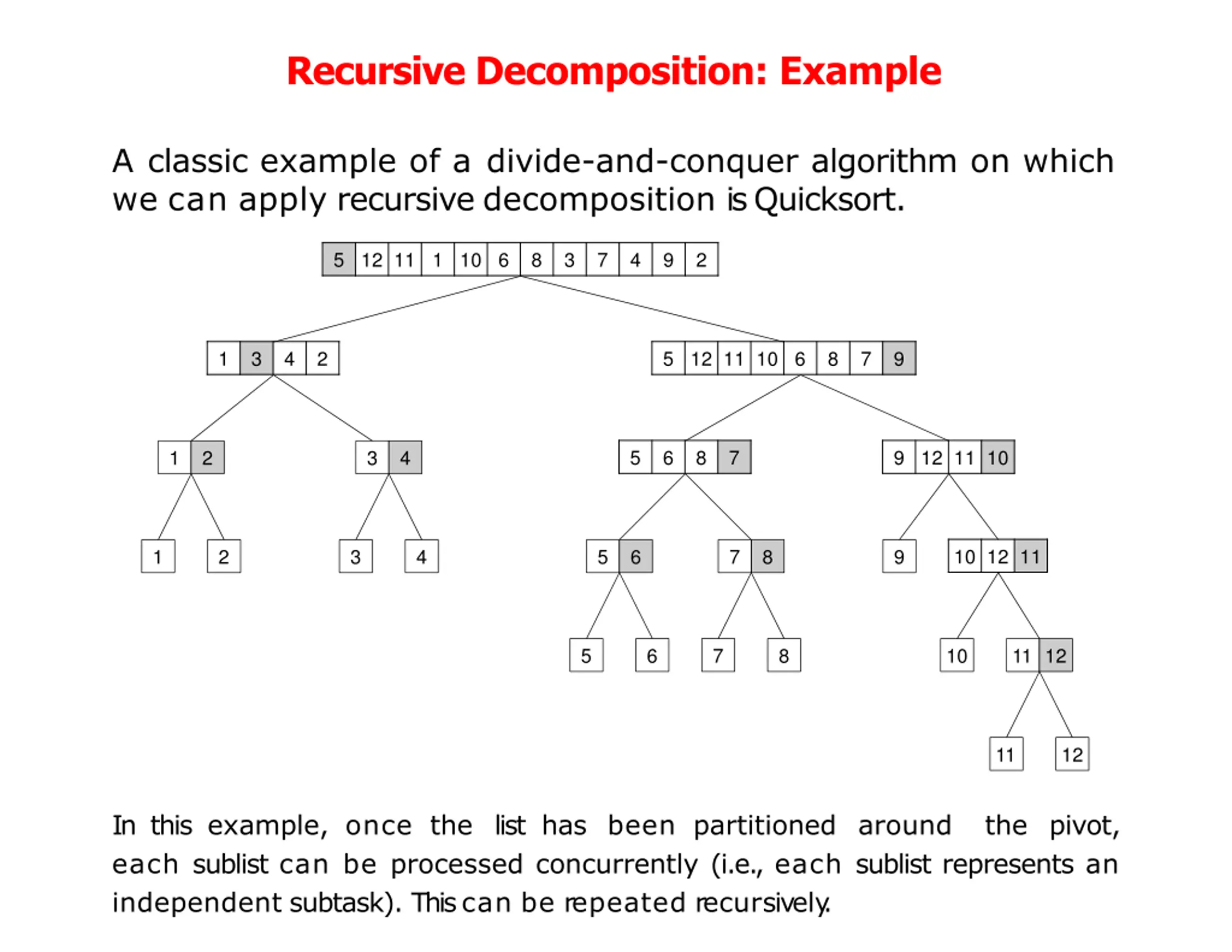 Recursive Decomposition: Example A classic example of a divide-and-conquer algorithm on which we can apply recursive decomposition isQuicksort. 5 12 11 1 10 6 8 3 7 4 9 2 1 3 4 2 5 12 11 10 6 8 7 9 5 6 8 7 9 12 11 10 1 2 3 4 10 12 11 5 6 7 8 1 2 3 4 9 11 12 5 6 7 8 10 11 12 In this example, once the list has been partitioned around each sublist can be processed concurrently (i.e., each sublist represents an independent subtask). Thiscan be repeated recursively . the pivot,