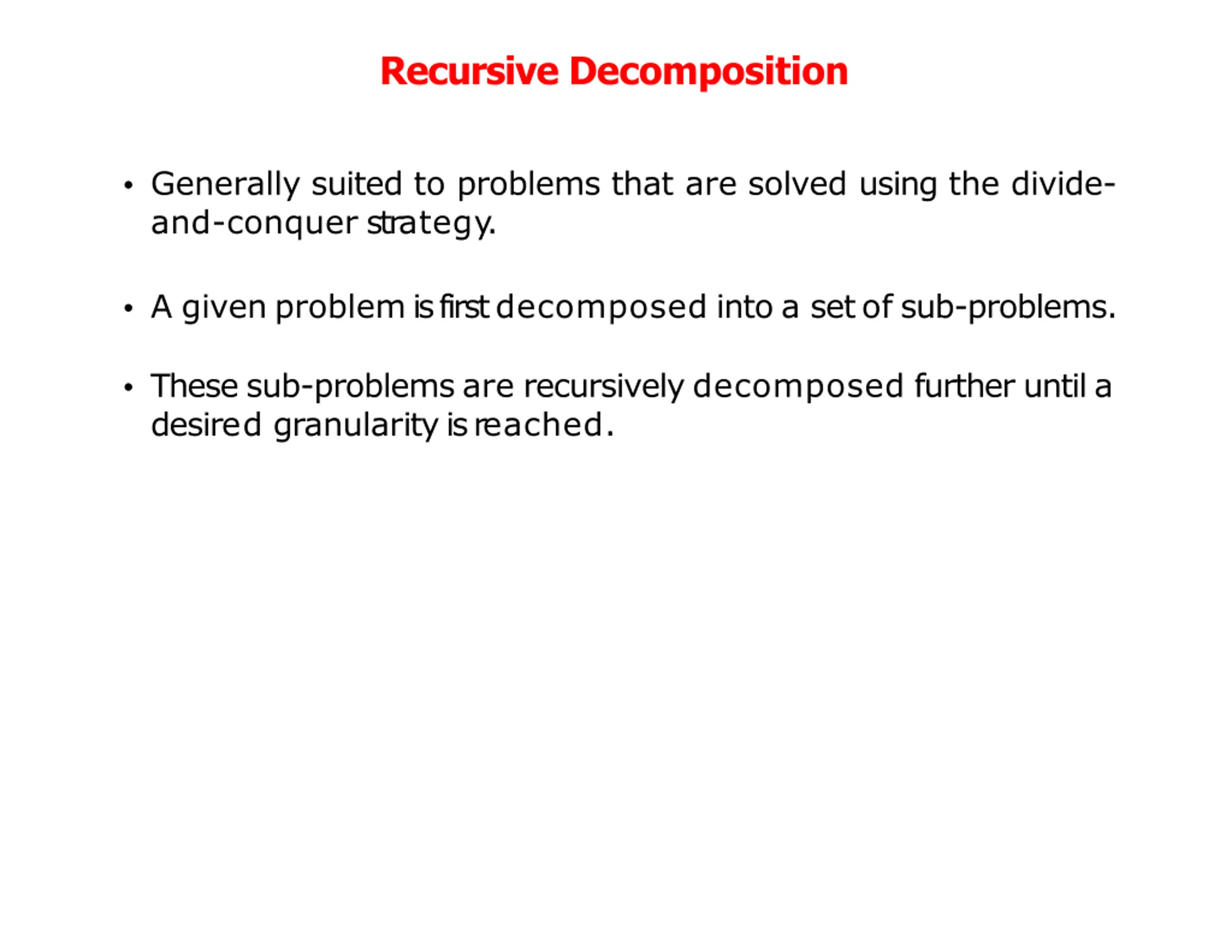 Recursive Decomposition Generally suited to problems that are solved using the divide- and-conquer strategy. A given problem isfirstdecomposed into a setof sub-problems. These sub-problems are recursively decomposed further until a desired granularityisreached.