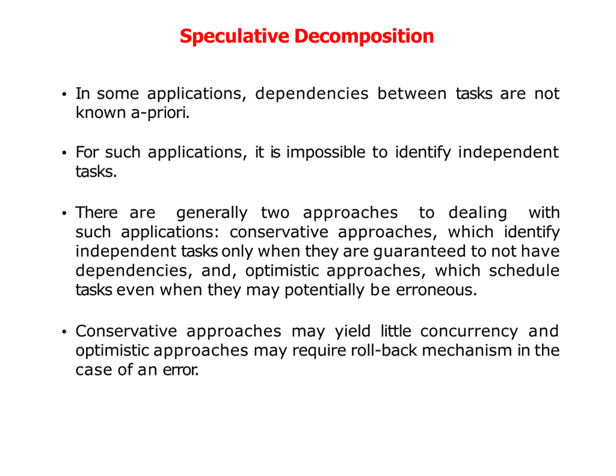 Speculative Decomposition In some applications, dependencies between tasks are not known a-priori. For such applications, it is impossible to identify independent tasks. There are such applications: conservative approaches, which identify independent tasksonly when they are guaranteed to not have dependencies, and, optimistic approaches, which schedule tasks even when they may potentially be erroneous. generally two approaches to dealing with Conservative approaches may yield little concurrency and optimistic approaches may require roll-back mechanism in the case of an error .