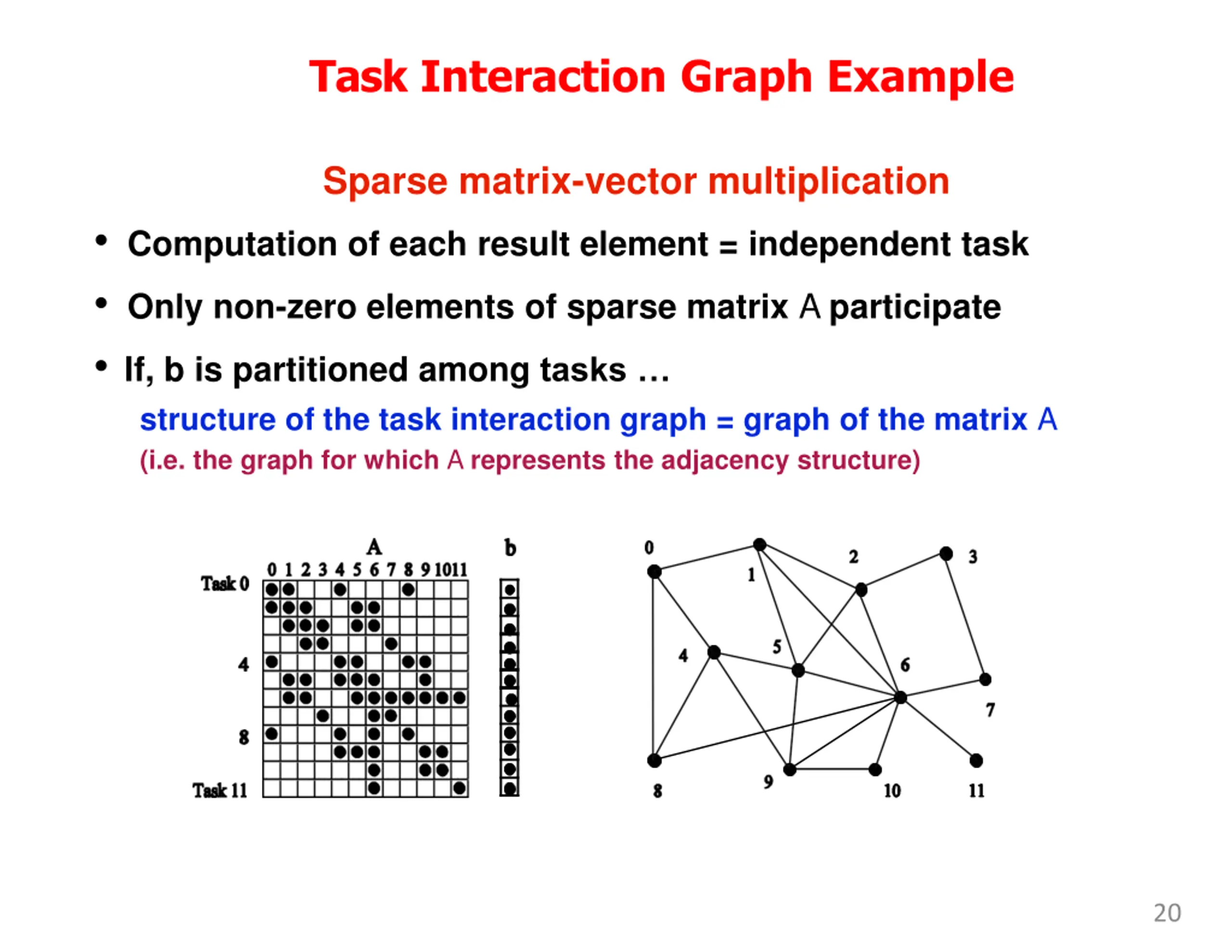 Task Interaction Graph Example Sparse matrix-vector multiplication Computation of each result element = independent task Only non-zero elements of sparse matrix A participate If, b is partitioned among tasks structure of the task interaction graph = graph of the matrix A (i.e. the graph for which A represents the adjacency structure) 20
